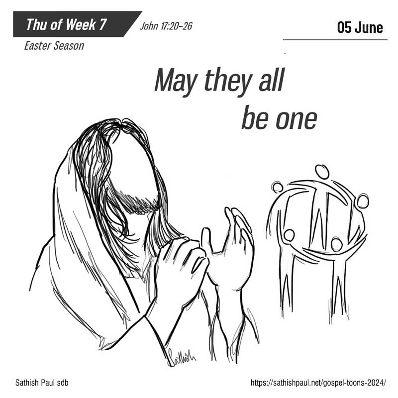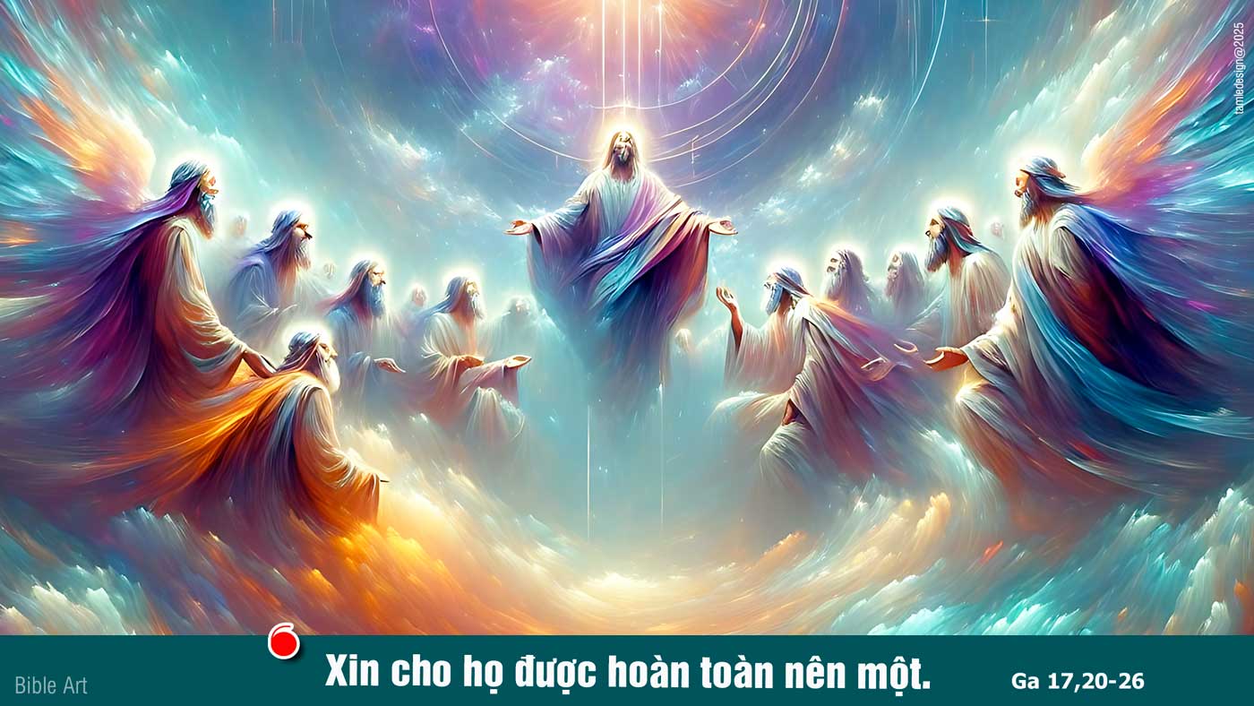 Khi ấy, Đức Giê-su ngước mắt lên trời và cầu nguyện rằng: “Lạy Cha, Con không chỉ cầu nguyện cho những người này, nhưng còn cho những ai nhờ lời họ mà tin vào con, để tất cả nên một, như Cha ở trong con và con ở trong Cha để họ cũng ở trong chúng ta. Như vậy, thế gian sẽ tin rằng Cha đã sai con. Phần con, con đã ban cho họ vinh quang mà Cha đã ban cho con, để họ được nên một như chúng ta là một: Con ở trong họ và Cha ở trong con, để họ được hoàn toàn nên một; như vậy, thế gian sẽ nhận biết là chính Cha đã sai con và đã yêu thương họ như đã yêu thương con. Lạy Cha, con muốn rằng con ở đâu, thì những người Cha đã ban cho con cũng ở đó với con, để họ chiêm ngưỡng vinh quang của con, vinh quang mà Cha đã ban cho con, vì Cha đã yêu thương con trước khi thế gian được tạo thành. Lạy Cha là Đấng công chính, thế gian đã không biết Cha, nhưng con, con đã biết Cha, và những người này đã biết là chính Cha đã sai con. Con đã cho họ biết danh Cha, và sẽ còn cho họ biết nữa, để tình Cha đã yêu thương con, ở trong họ, và con cũng ở trong họ nữa.” Đó là lời Chúa.
