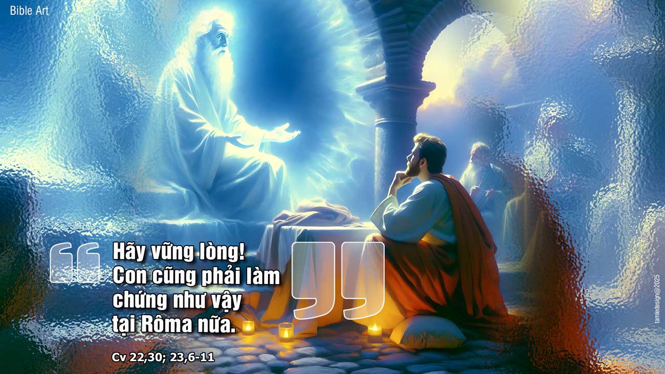 Hôm ấy, vì muốn biết chắc chắn người Do-thái tố cáo ông Phao-lô về điều gì, vị chỉ huy tháo xiềng cho ông và ra lệnh cho các thượng tế và toàn thể Thượng Hội Đồng họp lại, rồi ông đưa ông Phao-lô từ đồn xuống, để ra trước mặt họ… Ông Phao-lô biết rằng một phần Thượng Hội Đồng thuộc phái Xa-đốc, còn phần kia thuộc phái Pha-ri-sêu, nên ông nói lớn tiếng giữa hội nghị: “Thưa anh em, tôi là người Pha-ri-sêu, thuộc dòng dõi Pha-ri-sêu; chính vì hy vọng rằng kẻ chết sẽ sống lại mà tôi bị đưa ra xét xử.” Ông vừa nói thế, thì người Pha-ri-sêu và người Xa-đốc chống đối nhau, khiến hội nghị chia rẽ. Thật vậy, người Xa-đốc chủ trương rằng chẳng có sự sống lại, chẳng có thiên sứ hay quỷ thần; còn người Pha-ri-sêu thì lại tin là có. Người ta la lối om sòm. Có mấy kinh sư thuộc phái Pha-ri-sêu đứng lên phản đối mạnh mẽ: “Chúng tôi không thấy người này có gì là xấu. Biết đâu một vị thần hay một thiên sứ đã nói với ông ấy?” Hai bên chống đối gay gắt đến nỗi vị chỉ huy sợ người ta xé xác ông Phao-lô, nên mới ra lệnh cho lính xuống lôi ông ra khỏi đám người đó mà đưa về đồn. Đêm ấy Chúa đến bên ông Phao-lô và nói: “Hãy vững lòng! Con đã long trọng làm chứng cho Thầy ở Giê-ru-sa-lem thế nào, thì con cũng phải làm chứng như vậy tại Rô-ma nữa.” Đó là lời Chúa.