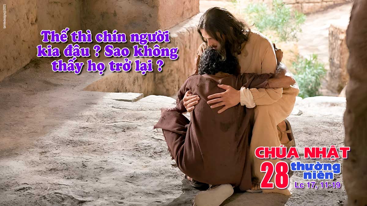 Trên đường lên Giê-ru-sa-lem, Đức Giê-su đi qua biên giới giữa hai miền Sa-ma-ri và Ga-li-lê. Lúc Người vào một làng kia, thì có mười người phong hủi đón gặp Người. Họ dừng lại đằng xa và kêu lớn tiếng: “Lạy Thầy Giê-su, xin dủ lòng thương chúng tôi!”  Thấy vậy, Đức Giê-su bảo họ: “Hãy đi trình diện với các tư tế.” Đang khi đi thì họ được sạch. Một người trong bọn, thấy mình được khỏi, liền quay trở lại và lớn tiếng tôn vinh Thiên Chúa. Anh ta sấp mình dưới chân Đức Giê-su mà tạ ơn. Anh ta lại là người Sa-ma-ri. Đức Giê-su mới nói: “Không phải cả mười người đều được sạch sao ? Thế thì chín người kia đâu? Sao không thấy họ trở lại tôn vinh Thiên Chúa, mà chỉ có người ngoại bang này?” Rồi Người nói với anh ta: “Đứng dậy về đi! Lòng tin của anh đã cứu chữa anh.” “Triều Đại Thiên Chúa đang ở giữa các ông”. Đó là Lời Chúa!