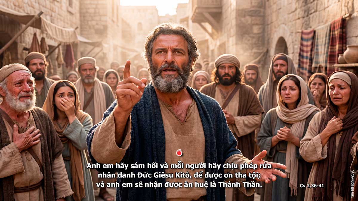 Trong ngày lễ Ngũ Tuần, ông Phê-rô nói với người Do-thái rằng: “Vậy toàn thể nhà Ít-ra-en phải biết chắc điều này: Đức Giê-su mà anh em đã treo trên thập giá, Thiên Chúa đã đặt Người làm Đức Chúa và làm Đấng Ki-tô.” Nghe thế, họ đau đớn trong lòng, và hỏi ông Phê-rô cùng các Tông Đồ khác: “Thưa các anh, vậy chúng tôi phải làm gì?” Ông Phê-rô đáp: “Anh em hãy sám hối, và mỗi người hãy chịu phép rửa nhân danh Đức Giê-su Ki-tô, để được ơn tha tội; và anh em sẽ nhận được ân huệ là Thánh Thần. Thật vậy, đó là điều Thiên Chúa đã hứa cho anh em, cũng như cho con cháu anh em và tất cả những người ở xa, tất cả những người mà Chúa là Thiên Chúa chúng ta sẽ kêu gọi.” Ông Phê-rô còn dùng nhiều lời khác để long trọng làm chứng và khuyên nhủ họ. Ông nói: “Anh em hãy tránh xa thế hệ gian tà này để được cứu độ.” Vậy những ai đã đón nhận lời ông, đều chịu phép rửa. Và hôm ấy đã có thêm khoảng ba ngàn người theo đạo. Đó là lời Chúa.