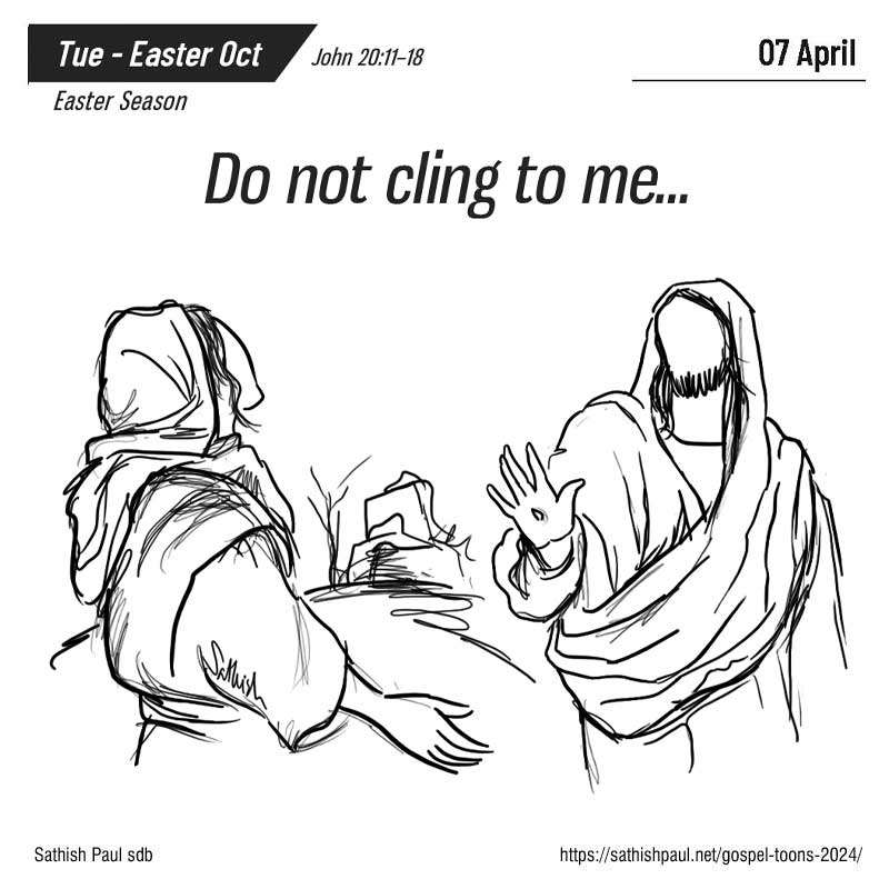 Jésus lui dit alors : « Marie ! » S’étant retournée, elle lui dit en hébreu : « Rabbouni ! », c’est-à-dire : Maître. Jésus reprend : « Ne me retiens pas, car je ne suis pas encore monté vers le Père. Va trouver mes frères pour leur dire que je monte vers mon Père et votre Père, vers mon Dieu et votre Dieu. » Marie Madeleine s’en va donc annoncer aux disciples : « J’ai vu le Seigneur ! », et elle raconta ce qu’il lui avait dit. (Jn 20, 11-18)