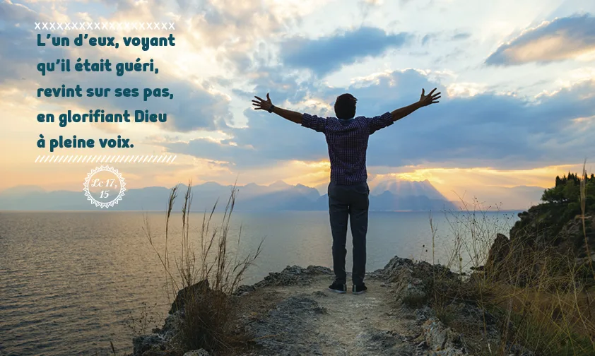 En cours de route, ils furent purifiés. L’un d’eux, voyant qu’il était guéri, revint sur ses pas, en glorifiant Dieu à pleine voix. Il se jeta face contre terre aux pieds de Jésus en lui rendant grâce. Or, c’était un Samaritain. Alors Jésus prit la parole en disant : « Tous les dix n’ont-ils pas été purifiés ? Les neuf autres, où sont-ils ? Il ne s’est trouvé parmi eux que cet étranger pour revenir sur ses pas et rendre gloire à Dieu ! » Jésus lui dit : « Relève-toi et va : ta foi t’a sauvé. (Lc 17, 11-19)