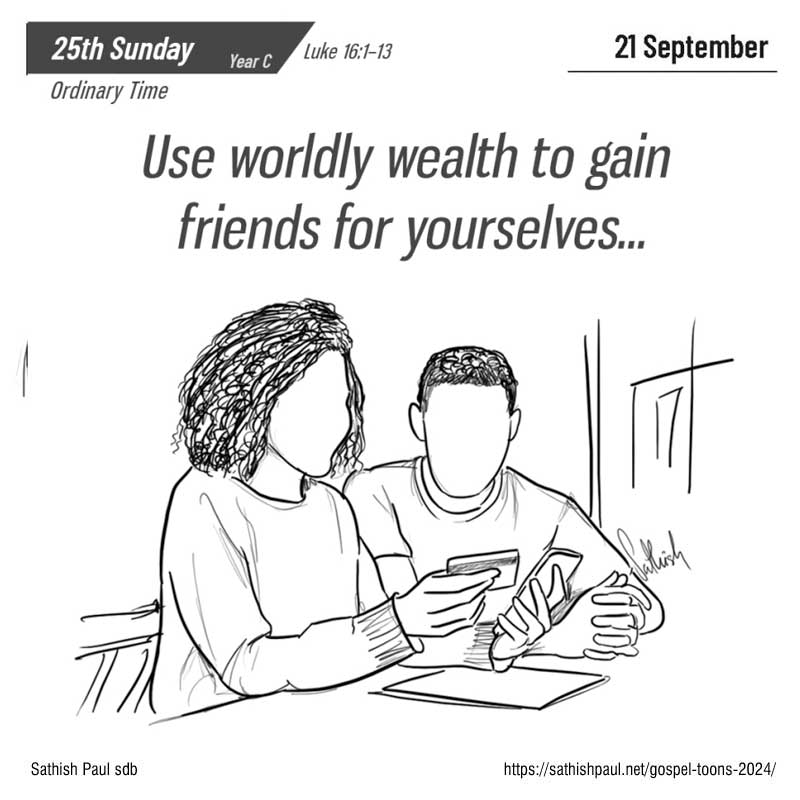 Le maître fit l’éloge de ce gérant malhonnête car il avait agi avec habileté ; en effet, les fils de ce monde sont plus habiles entre eux que les fils de la lumière. Eh bien moi, je vous le dis : Faites-vous des amis avec l’argent malhonnête, afin que, le jour où il ne sera plus là, ces amis vous accueillent dans les demeures éternelles. (Lc 16, 1-13)