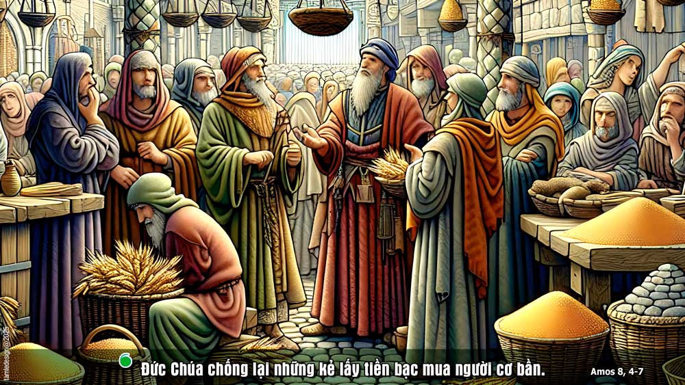 Hãy nghe đây, hỡi những ai đàn áp người cùng khổ và tiêu diệt kẻ nghèo hèn trong xứ. Các ngươi thầm nghĩ: “Bao giờ ngày mồng một qua đi, cho ta còn bán lúa; bao giờ mới hết ngày sa-bát, để ta bày thóc ra? Ta sẽ làm cho cái đấu nhỏ lại, cho quả cân nặng thêm; Ta sẽ làm lệch cán cân để đánh lừa thiên hạ. Ta sẽ lấy tiền bạc mua đứa cơ bần, đem đôi dép đổi lấy tên cùng khổ; cả lúa nát gạo mục, ta cũng đem ra bán.” Đức Chúa đã lấy thánh danh là niềm hãnh diện của Gia-cóp mà thề: Ta sẽ chẳng bao giờ quên một hành vi nào của chúng. Ðó là lời Chúa.