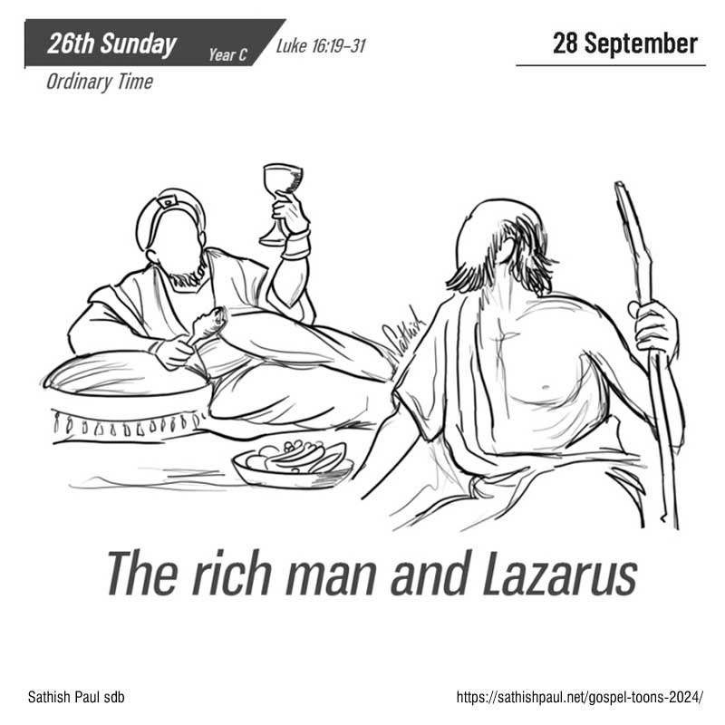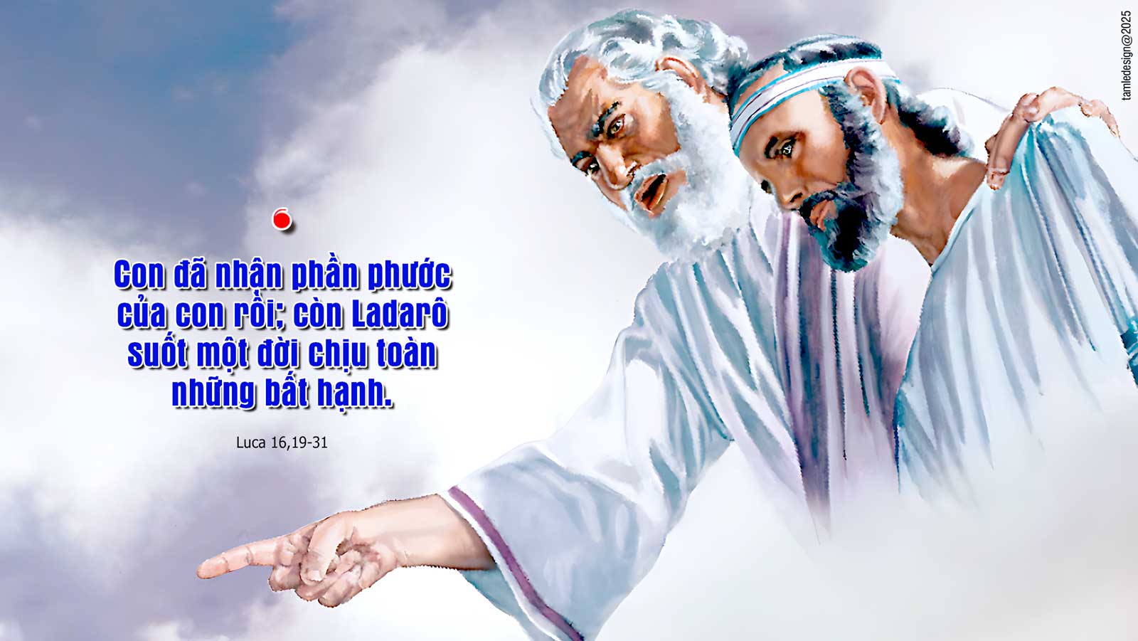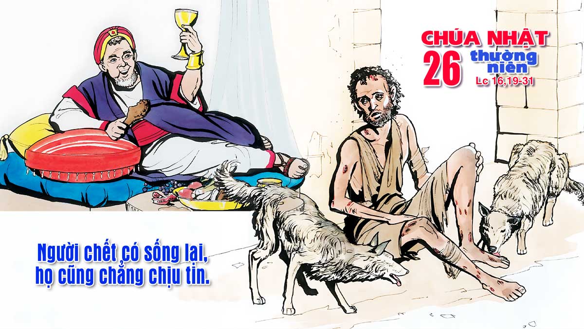 Khi ấy, Đức Giêsu nói với người Pha-ri-sêu dụ ngôn sau đây: “Có một ông nhà giàu kia, mặc toàn lụa là gấm vóc, ngày ngày yến tiệc linh đình. Lại có một người nghèo khó tên là La-da-rô, mụn nhọt đầy mình, nằm trước cổng ông nhà giàu, thèm được những thứ y trên bàn ăn của ông ấy rớt xuống mà ăn cho no. Lại thêm mấy con chó cứ đến liếm ghẻ chốc anh ta. Thế rồi người nghèo này chết, và được thiên thần đem vào lòng ông Áp-ra-ham. Ông nhà giàu cũng chết, và người ta đem chôn. “Dưới âm phủ, đang khi chịu cực hình, ông ta ngước mắt lên, thấy tổ phụ Áp-ra-ham ở tận đàng xa, và thấy anh La-da-rô trong lòng tổ phụ. Bấy giờ ông ta kêu lên: ‘Lạy tổ phụ Áp-ra-ham, xin thương xót con, và sai anh La-da-rô nhúng đầu ngón tay vào nước, nhỏ trên lưỡi con cho mát; vì ở đây con bị lửa thiêu đốt khổ lắm!’ Ông Áp-ra-ham đáp: ‘Con ơi, hãy nhớ lại: suốt đời con, con đã nhận phần phước của con rồi; còn La-da-rô suốt một đời chịu toàn những bất hạnh. Bây giờ, La-da-rô được an ủi nơi đây, còn con thì phải chịu khốn khổ. Hơn nữa, giữa chúng ta đây và các con đã có một vực thẳm lớn, đến nỗi bên này muốn qua bên các con cũng không được, mà bên đó có qua bên chúng ta đây cũng không được.’“Ông nhà giàu nói: ‘Lạy tổ phụ, vậy thì con xin tổ phụ sai anh La-da-rô đến nhà cha con, vì con hiện còn năm người anh em nữa. Xin sai anh đến cảnh cáo họ, kẻo họ lại cũng sa vào chốn cực hình này!’ Ông Áp-ra-ham đáp: ‘Chúng đã có Mô-sê và các Ngôn Sứ, thì chúng cứ nghe lời các vị đó.’ Ông nhà giàu nói: ‘Thưa tổ phụ Áp-ra-ham, họ không chịu nghe đâu, nhưng nếu có người từ cõi chết đến với họ, thì họ sẽ ăn năn sám hối.’ Ông Áp-ra-ham đáp: ‘Mô-sê và các Ngôn Sứ mà họ còn chẳng chịu nghe, thì người chết có sống lại, họ cũng chẳng chịu tin.’” Ðó là lời Chúa.