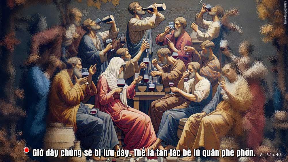 Ðức Chúa là Thiên Chúa các đạo binh phán thế này: Khốn cho những kẻ sống yên ổn tại Xi-on, và sống an nhiên tự tại trên núi Sa-ma-ri. Chúng nằm dài trên giường ngà, ngả ngớn trên trường kỷ, mà ăn những chiên non nhất bầy, những bê béo nhất chuồng. Chúng đàn hát nghêu ngao; như Đa-vít, chúng dùng nhạc cụ mà sáng tác. Chúng uống rượu cả bầu, xức dầu thơm hảo hạng, nhưng chẳng biết đau lòng trước cảnh nhà Giu-se sụp đổ! Vì thế, giờ đây chúng sẽ bị lưu đày, dẫn đầu những kẻ bị lưu đày. Thế là tan tác bè lũ quân phè phỡn! Ðó là lời Chúa.