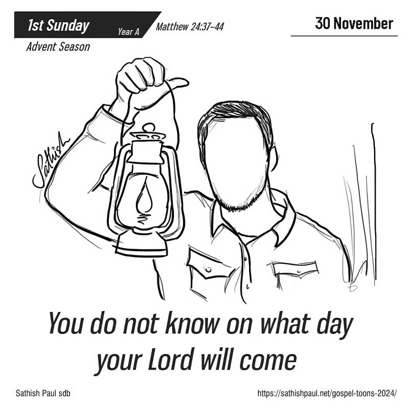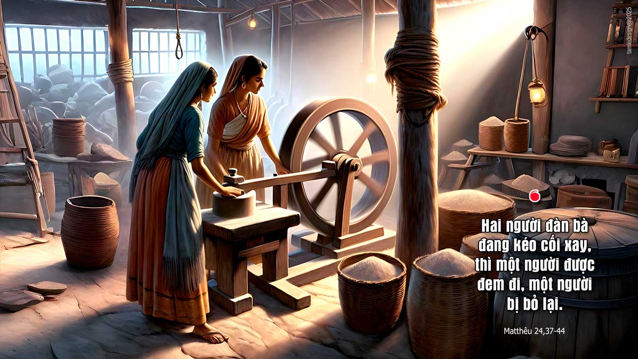 Khi ấy, Đức Giê-su nói với các môn đệ rằng: “Thời ông Nô-ê thế nào, thì ngày Con Người quang lâm cũng sẽ như vậy. Vì trong những ngày trước nạn hồng thuỷ, thiên hạ vẫn ăn uống, cưới vợ lấy chồng, mãi cho đến ngày ông Nô-ê vào tàu. Họ không hay biết gì, cho đến khi nạn hồng thuỷ ập tới cuốn đi hết thảy. Ngày Con Người quang lâm cũng sẽ như vậy. Bấy giờ, hai người đàn ông đang làm ruộng, thì một người được đem đi, một người bị bỏ lại; hai người đàn bà đang kéo cối xay, thì một người được đem đi, một người bị bỏ lại. “Vậy anh em hãy canh thức, vì anh em không biết ngày nào Chúa của anh em đến. Anh em hãy biết điều này: nếu chủ nhà biết vào canh nào kẻ trộm sẽ đến, hẳn ông đã thức, không để nó khoét vách nhà mình đâu. Cho nên anh em cũng vậy, anh em hãy sẵn sàng, vì chính giờ phút anh em không ngờ, thì Con Người sẽ đến. Đó là lời Chúa.