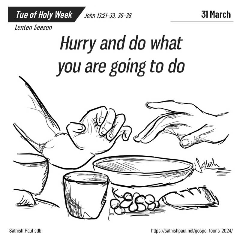 Khi ấy, đang lúc Chúa Giê-su dùng bữa với các môn đệ, Người cảm thấy tâm thần xao xuyến. Người tuyên bố: “Thật, Thầy bảo thật anh em: có một người trong anh em sẽ nộp Thầy.” Các môn đệ nhìn nhau, phân vân không biết Người nói về ai. Trong số các môn đệ, có một người được Đức Giê-su thương mến. Ông đang dùng bữa, đầu tựa vào lòng Đức Giê-su. Ông Si-mon Phê-rô làm hiệu cho ông ấy và bảo: “Hỏi xem Thầy muốn nói về ai?” Ông này liền nghiêng mình vào ngực Đức Giê-su và hỏi: “Thưa Thầy, ai vậy?” Đức Giê-su trả lời: “Thầy chấm bánh đưa cho ai, thì chính là kẻ ấy.” Rồi Người chấm một miếng bánh, trao cho Giu-đa, con ông Si-mon Ít-ca-ri-ốt. Y vừa ăn xong miếng bánh, Xa-tan liền nhập vào y. Đức Giê-su bảo y: “Anh làm gì thì làm mau đi!” Nhưng trong số các người đang dùng bữa, không ai hiểu tại sao Người nói với y như thế. Vì Giu-đa giữ túi tiền, nên có vài người tưởng rằng Đức Giê-su nói với y: “Hãy mua những món cần dùng trong dịp lễ”, hoặc bảo y bố thí cho người nghèo. Sau khi ăn miếng bánh, Giu-đa liền đi ra. Lúc đó, trời đã tối. Khi Giu-đa đi rồi, Đức Giê-su nói: “Giờ đây, Con Người được tôn vinh, và Thiên Chúa cũng được tôn vinh nơi Người. Nếu Thiên Chúa được tôn vinh nơi Người, thì Thiên Chúa cũng sẽ tôn vinh Người nơi chính mình, và Thiên Chúa sắp tôn vinh Người. Hỡi anh em là những người con bé nhỏ của Thầy, Thầy còn ở với anh em một ít lâu nữa thôi. Anh em sẽ tìm kiếm Thầy; nhưng như Thầy đã nói với người Do-thái: ‘Nơi tôi đi, các người không thể đến được, bấy giờ, Thầy cũng nói với anh em như vậy… Ông Si-mon Phê-rô nói với Đức Giê-su: “Thưa Thầy, Thầy đi đâu vậy?” Đức Giê-su trả lời: “Nơi Thầy đi, bây giờ anh không thể theo đến được; nhưng sau này anh sẽ đi theo.” Ông Phê-rô thưa: “Thưa Thầy, sao con lại không thể đi theo Thầy ngay bây giờ được? Con sẽ thí mạng con vì Thầy!” Đức Giê-su đáp: “Anh sẽ thí mạng vì Thầy ư? Thật, Thầy bảo thật cho anh biết: gà chưa gáy, anh đã chối Thầy ba lần. Đó là lời Chúa.