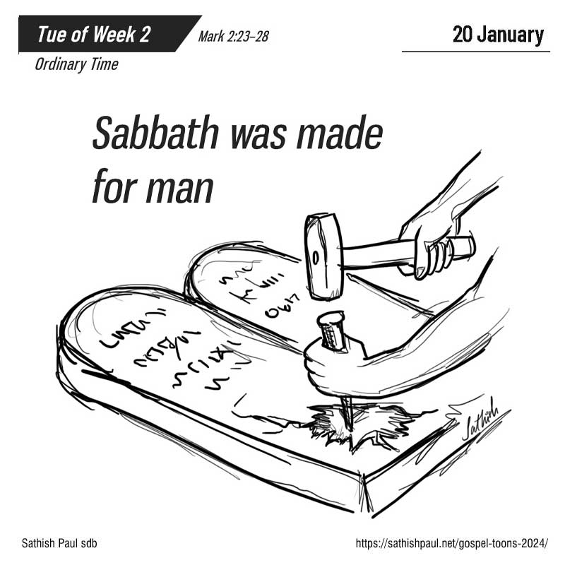 Au temps du grand prêtre Abiatar, il entra dans la maison de Dieu et mangea les pains de l’offrande que nul n’a le droit de manger, sinon les prêtres, et il en donna aussi à ceux qui l’accompagnaient. » Il leur disait encore : « Le sabbat a été fait pour l’homme, et non pas l’homme pour le sabbat. Voilà pourquoi le Fils de l’homme est maître, même du sabbat. » (Mc 2, 23-28)