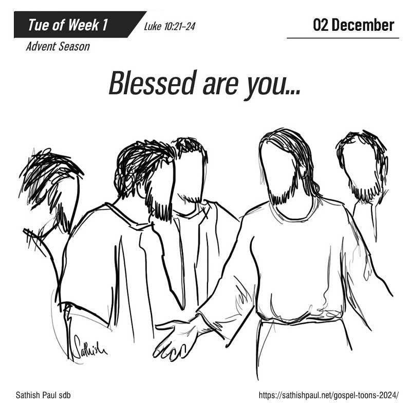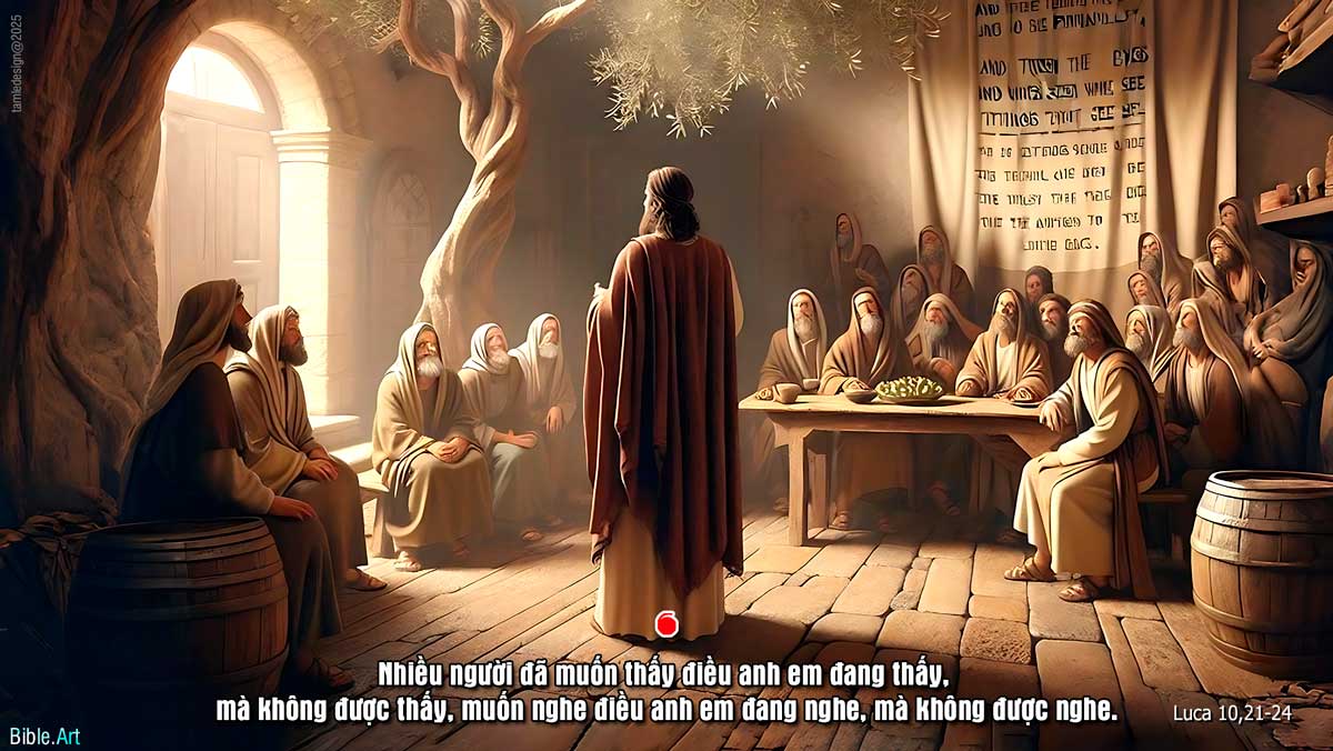 Được Thánh Thần tác động, Đức Giê-su hớn hở vui mừng nói: “Lạy Cha là Chúa Tể trời đất, con xin ngợi khen Cha, vì Cha đã giấu kín không cho bậc khôn ngoan thông thái biết những điều này, nhưng lại mặc khải cho những người bé mọn. Vâng, lạy Cha, vì đó là điều đẹp ý Cha. Cha tôi đã giao phó mọi sự cho tôi. Và không ai biết người Con là ai, trừ Chúa Cha, cũng như không ai biết Chúa Cha là ai, trừ người Con, và kẻ mà người Con muốn mặc khải cho.” Rồi Đức Giê-su quay lại với các môn đệ và bảo riêng: “Phúc thay mắt nào được thấy điều anh em thấy! Quả vậy, Thầy bảo cho anh em biết: nhiều ngôn sứ và nhiều vua chúa đã muốn thấy điều anh em đang thấy, mà không được thấy, muốn nghe điều anh em đang nghe, mà không được nghe.” Đó là lời Chúa.