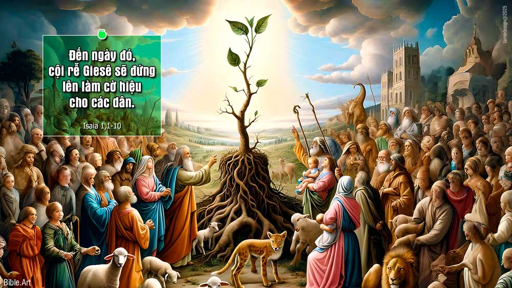 Ngày ấy, từ gốc tổ Gie-sê, sẽ đâm ra một nhánh nhỏ, từ cỗi rễ ấy, sẽ mọc lên một mầm non. Thần khí Đức Chúa sẽ ngự trên vị này: thần khí khôn ngoan và minh mẫn, thần khí mưu lược và dũng mãnh, thần khí hiểu biết và kính sợ Đức Chúa. Lòng kính sợ Đức Chúa làm cho Người hứng thú, Người sẽ không xét xử theo dáng vẻ bên ngoài, cũng không phán quyết theo lời kẻ khác nói, nhưng xét xử công minh cho người thấp cổ bé miệng, và phán quyết vô tư bênh kẻ nghèo trong xứ sở. Lời Người nói là cây roi đánh vào xứ sở, hơi miệng thở ra giết chết kẻ gian tà. Đai thắt ngang lưng là đức công chính, giải buộc bên sườn là đức tín thành. Bấy giờ sói sẽ ở với chiên con, beo nằm bên dê nhỏ. Bò tơ và sư tử non được nuôi chung với nhau, một cậu bé sẽ chăn dắt chúng. Bò cái kết thân cùng gấu cái, con của chúng nằm chung một chỗ, sư tử cũng ăn rơm như bò. Bé thơ còn đang bú giỡn chơi bên hang rắn lục, trẻ thơ vừa cai sữa thọc tay vào ổ rắn hổ mang. Sẽ không còn ai tác hại và tàn phá trên khắp núi thánh của Ta, vì sự hiểu biết Đức Chúa sẽ tràn ngập đất này, cũng như nước lấp đầy lòng biển. Đến ngày đó, cội rễ Gie-sê sẽ đứng lên làm cờ hiệu cho các dân. Các dân tộc sẽ tìm kiếm Người, và nơi Người ngự sẽ rực rỡ vinh quang. Đó là lời Chúa.
