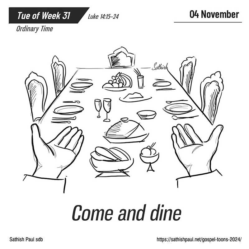 Jésus lui dit : « Un homme donnait un grand dîner, et il avait invité beaucoup de monde. À l’heure du dîner, il envoya son serviteur dire aux invités : “Venez, tout est prêt.” Mais ils se mirent tous, unanimement, à s’excuser. Le premier lui dit : “J’ai acheté un champ, et je suis obligé d’aller le voir ; je t’en prie, excuse-moi.” Un autre dit : “J’ai acheté cinq paires de bœufs, et je pars les essayer… (Lc 14, 15-24)