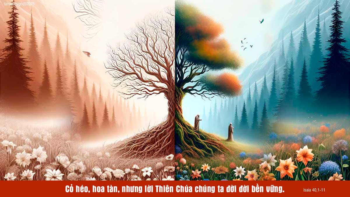 Thiên Chúa phán: “Hãy an ủi, an ủi dân Ta: Hãy ngọt ngào khuyên bảo Giê-ru-sa-lem, và hô lên cho Thành: thời phục dịch cho Thành đã mãn, tội của Thành đã đền xong, vì Thành đã bị tay Đức Chúa giáng phạt gấp hai lần tội phạm.” Có tiếng hô: “Trong sa mạc, hãy mở một con đường cho Đức Chúa, giữa đồng hoang, hãy vạch một con lộ thẳng băng cho Thiên Chúa chúng ta. Mọi thung lũng sẽ được lấp đầy, mọi núi đồi sẽ phải bạt xuống, nơi lồi lõm sẽ hoá thành đồng bằng, chốn gồ ghề nên vùng đất phẳng phiu. Bấy giờ vinh quang Đức Chúa sẽ tỏ hiện, và mọi người phàm sẽ cùng được thấy rằng miệng Đức Chúa đã tuyên phán.” Có tiếng nói: “Hãy hô lên!” Tôi thưa: “Phải hô lên điều gì?” –“Người phàm nào cũng đều là cỏ, mọi vẻ đẹp của nó như hoa đồng nội. Cỏ héo, hoa tàn khi thần khí Đức Chúa thổi qua. Phải, dân là cỏ: cỏ héo, hoa tàn, nhưng lời của Thiên Chúa chúng ta đời đời bền vững.” Hỡi kẻ loan tin mừng cho Xi-on, hãy trèo lên núi cao. Hỡi kẻ loan tin mừng cho Giê-ru-sa-lem, hãy cất tiếng lên cho thật mạnh. Cất tiếng lên, đừng sợ, hãy bảo các thành miền Giu-đa rằng: “Kìa Thiên Chúa các ngươi!” Kìa Đức Chúa quang lâm hùng dũng, tay nắm trọn chủ quyền. Bên cạnh Người, này công lao lập được, trước mặt Người, đây sự nghiệp làm nên. Như mục tử, Chúa chăn giữ đoàn chiên của Chúa, tập trung cả đoàn dưới cánh tay. Lũ chiên con, Người ấp ủ vào lòng, bầy chiên mẹ, cũng tận tình dẫn dắt. Đó là lời Chúa.