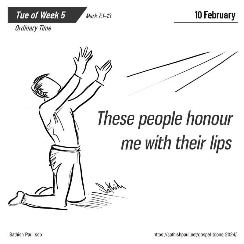 Alors les pharisiens et les scribes demandèrent à Jésus : « Pourquoi tes disciples ne suivent-ils pas la tradition des anciens ? Ils prennent leurs repas avec des mains impures. » Jésus leur répondit : « Isaïe a bien prophétisé à votre sujet, hypocrites, ainsi qu’il est écrit : Ce peuple m’honore des lèvres, mais son cœur est loin de moi. C’est en vain qu’ils me rendent un culte ; les doctrines qu’ils enseignent ne sont que des préceptes humains.  (Mc 7,1-13)