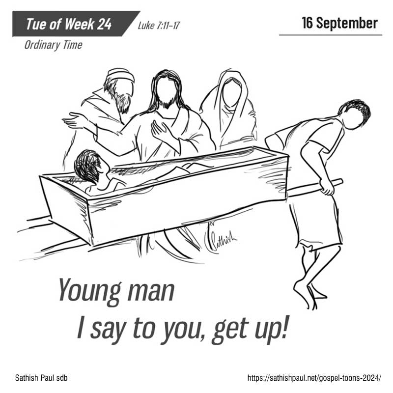Il arriva près de la porte de la ville au moment où l’on emportait un mort pour l’enterrer ; c’était un fils unique, et sa mère était veuve. Une foule importante de la ville accompagnait cette femme. Voyant celle-ci, le Seigneur fut saisi de compassion pour elle et lui dit : « Ne pleure pas. » Il s’approcha et toucha le cercueil ; les porteurs s’arrêtèrent, et Jésus dit : « Jeune homme, je te l’ordonne, lève-toi. » (Lc 7, 11-17)