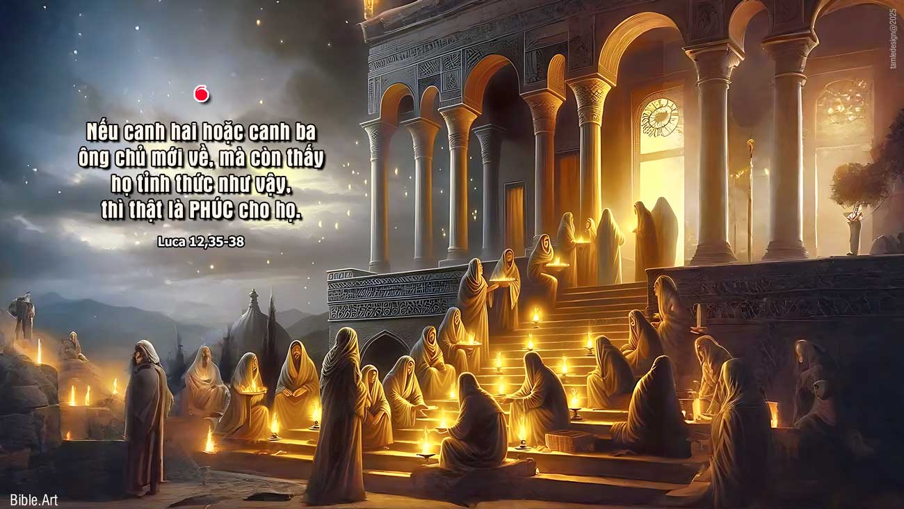 Một hôm, Đức Giê-su nói với các môn đệ rằng: “Anh em hãy thắt lưng cho gọn, thắp đèn cho sẵn. Hãy làm như những người đợi chủ đi ăn cưới về, để khi chủ vừa về tới và gõ cửa, là mở ngay. Khi chủ về mà thấy những đầy tớ ấy đang tỉnh thức, thì thật là phúc cho họ. Thầy bảo thật anh em: chủ sẽ thắt lưng, đưa họ vào bàn ăn, và đến bên từng người mà phục vụ. Nếu canh hai hoặc canh ba ông chủ mới về, mà còn thấy họ tỉnh thức như vậy, thì thật là phúc cho họ.” Đó là lời Chúa.