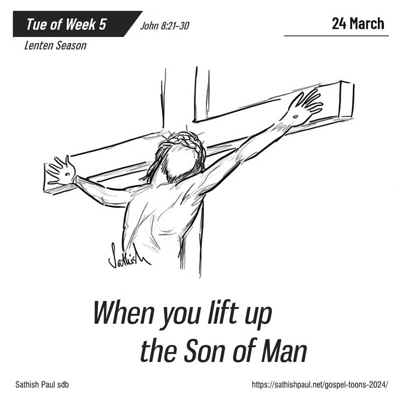 « Quand vous aurez élevé le Fils de l’homme, alors vous comprendrez que moi, JE SUIS, et que je ne fais rien de moi-même ; ce que je dis là, je le dis comme le Père me l’a enseigné. Celui qui m’a envoyé est avec moi ; il ne m’a pas laissé seul, parce que je fais toujours ce qui lui est agréable. » (Jn 8, 21-30)