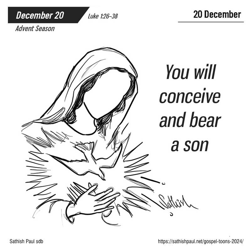 Marie dit à l’ange : « Comment cela va-t-il se faire, puisque je ne connais pas d’homme ? » L’ange lui répondit : « L’Esprit Saint viendra sur toi, et la puissance du Très-Haut te prendra sous son ombre ; c’est pourquoi celui qui va naître sera saint, il sera appelé Fils de Dieu. (Lc 1, 26-38)