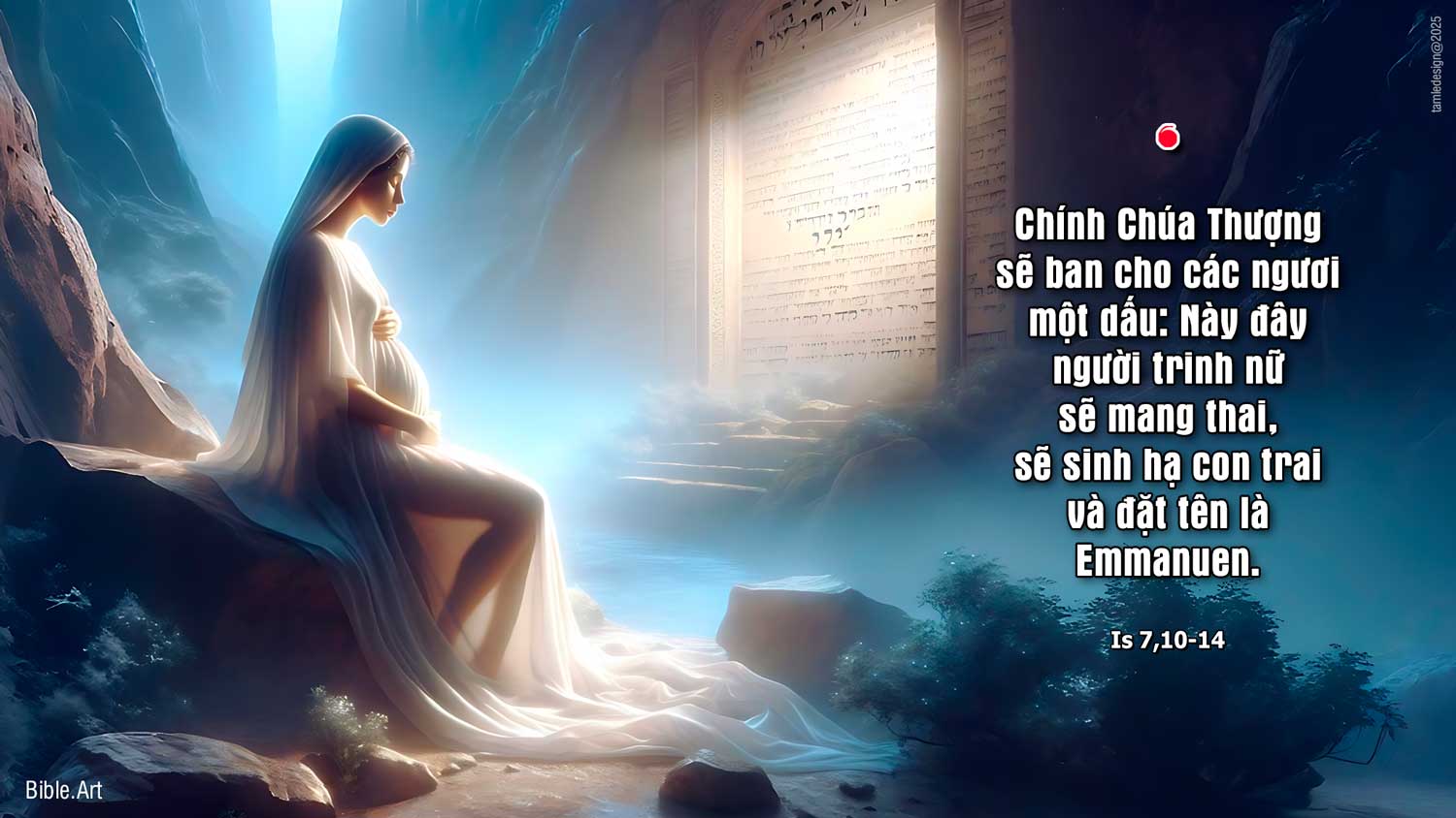 Khi ấy, Đức Chúa sai ngôn sứ I-sai-a nói với vua A-khát rằng: “Ngươi cứ xin Đức Chúa là Thiên Chúa của ngươi ban cho ngươi một dấu dưới đáy âm phủ hoặc trên chốn cao xanh.” Vua A-khát trả lời: “Tôi sẽ không xin, tôi không dám thử thách Đức Chúa.” Ông I-sai-a bèn nói: “Nghe đây, hỡi nhà Đa-vít, các ngươi làm phiền thiên hạ chưa đủ sao, mà còn muốn làm phiền cả Thiên Chúa của tôi nữa? Vì vậy, chính Chúa Thượng sẽ ban cho các ngươi một dấu: Này đây người trinh nữ sẽ mang thai, sẽ sinh hạ con trai, và đặt tên là Em-ma-nu-en.” Đó là lời Chúa.