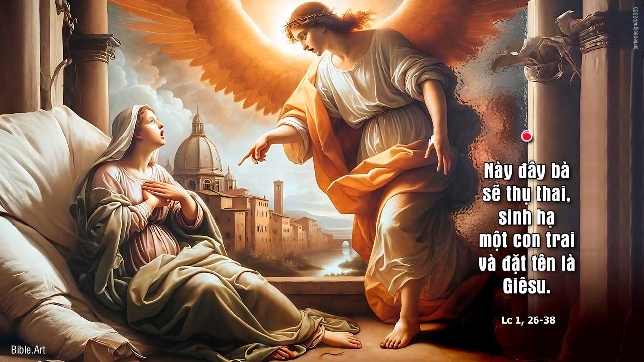 Bà Ê-li-sa-bét có thai được sáu tháng, thì Thiên Chúa sai sứ thần Gáp-ri-en đến một thành miền Ga-li-lê, gọi là Na-da-rét, gặp một trinh nữ đã đính hôn với một người tên là Giu-se, thuộc nhà Đa-vít. Trinh nữ ấy tên là Ma-ri-a. Sứ thần vào nhà trinh nữ và nói: “Mừng vui lên, hỡi Đấng đầy ân sủng, Đức Chúa ở cùng ba.” Nghe lời ấy, bà rất bối rối, và tự hỏi lời chào như vậy có nghĩa gì. Sứ thần liền nói: “Thưa bà Ma-ri-a, xin đừng sợ, vì bà đẹp lòng Thiên Chúa. Và này đây bà sẽ thụ thai, sinh hạ một con trai, và đặt tên là Giê-su. Người sẽ nên cao cả, và sẽ được gọi là Con Đấng Tối Cao. Đức Chúa là Thiên Chúa sẽ ban cho Người ngai vàng vua Đa-vít, tổ tiên Người. Người sẽ trị vì nhà Gia-cóp đến muôn đời, và triều đại của Người sẽ vô cùng vô tận.” Bà Ma-ri-a thưa với sứ thần: “Việc ấy sẽ xảy ra cách nào, vì tôi không biết đến việc vợ chồng!” Sứ thần đáp: “Thánh Thần sẽ ngự xuống trên bà, và quyền năng Đấng Tối Cao sẽ rợp bóng trên bà, vì thế, Đấng Thánh sắp sinh ra sẽ được gọi là Con Thiên Chúa. Kìa bà Ê-li-sa-bét, người họ hàng với bà, tuy già rồi, mà cũng đang cưu mang một người con trai: bà ấy vẫn bị mang tiếng là hiếm hoi, mà nay đã có thai được sáu tháng. Vì đối với Thiên Chúa, không có gì là không thể làm được.” Bấy giờ bà Ma-ri-a nói: “Vâng, tôi đây là nữ tỳ của Chúa, xin Chúa cứ làm cho tôi như lời sứ thần nói.” Rồi sứ thần từ biệt ra đi. Đó là lời Chúa.