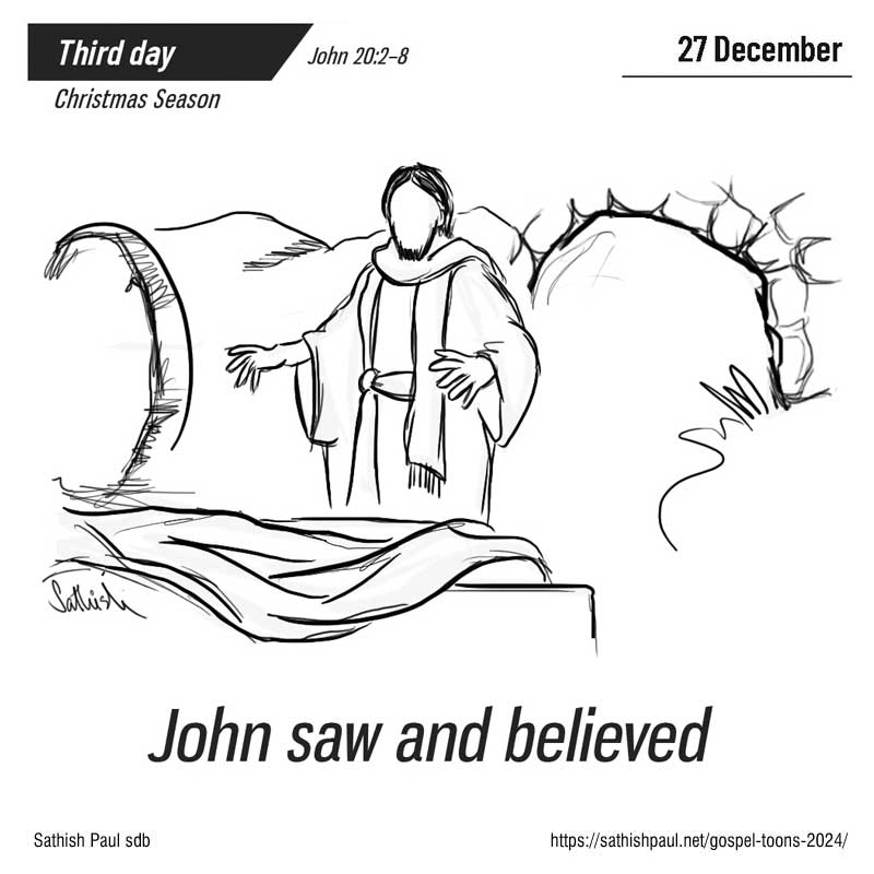 Sáng sớm ngày Phục Sinh, bà Ma-ri-a Mác-đa-la chạy đi gặp ông Si-mon Phê-rô và người môn đệ Đức Giê-su thương mến. Bà nói: “Người ta đã đem Chúa đi khỏi mộ; và chúng tôi chẳng biết họ để Người ở đâu?” Ông Phê-rô và môn đệ kia liền đi ra mộ. Cả hai người cùng chạy. Nhưng môn đệ kia chạy mau hơn ông Phê-rô và đã tới mộ trước. Ông cúi xuống và nhìn thấy những băng vải còn ở đó, nhưng không vào. Ông Si-mon Phê-rô theo sau cũng đến nơi. Ông vào thẳng trong mộ, thấy những băng vải để ở đó, và khăn che đầu Đức Giê-su. Khăn này không để lẫn với các băng vải, nhưng cuốn lại, xếp riêng ra một nơi. Bấy giờ người môn đệ kia, kẻ đã tới mộ trước, cũng đi vào. Ông đã thấy và đã tin. Đó là lời Chúa.