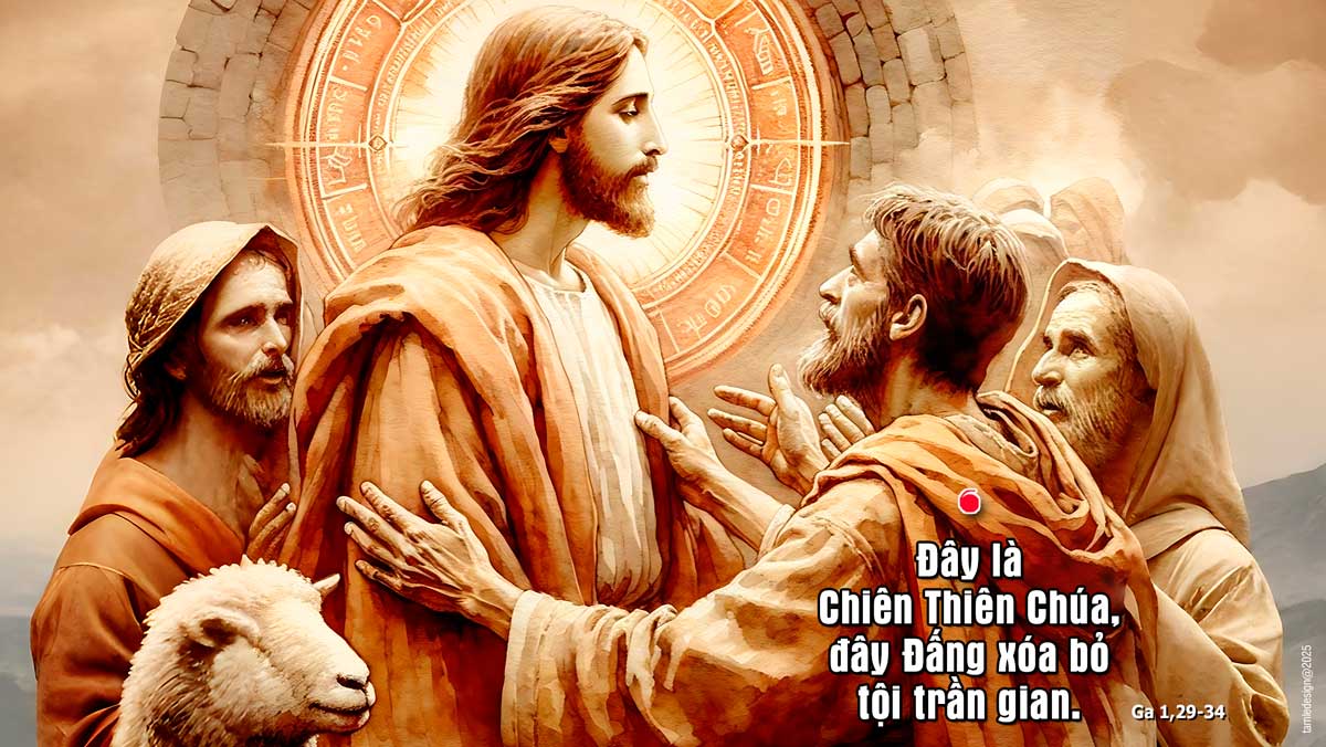 Một hôm, ông Gio-an thấy Đức Giê-su tiến về phía mình, liền nói: “Đây là Chiên Thiên Chúa, đây Đấng xóa bỏ tội trần gian. Chính Người là Đấng tôi đã nói tới khi bảo rằng: Có người đến sau tôi, nhưng trổi hơn tôi, vì có trước tôi. Tôi đã không biết Người, nhưng để Người được tỏ ra cho dân Ít-ra-en, tôi đến làm phép rửa trong nước.” Ông Gio-an còn làm chứng: “Tôi đã thấy Thần Khí tựa chim bồ câu từ trời xuống và ngự trên Người. Tôi đã không biết Người. Nhưng chính Đấng sai tôi đi làm phép rửa trong nước đã bảo tôi: “Ngươi thấy Thần Khí xuống và ngự trên ai, thì người đó chính là Đấng làm phép rửa trong Thánh Thần.” Tôi đã thấy, nên xin chứng thực rằng Người là Đấng Thiên Chúa tuyển chọn.” Đó là lời Chúa.