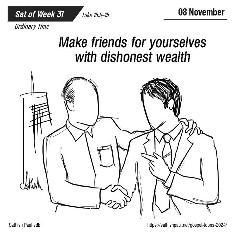 Khi ấy, Đức Giê-su nói với các môn đệ rằng: “Thầy bảo cho anh em biết: hãy dùng tiền của bất chính mà tạo lấy bạn bè, phòng khi hết tiền hết bạc, họ sẽ đón rước anh em vào nơi ở vĩnh cửu. Ai trung tín trong việc rất nhỏ, thì cũng trung tín trong việc lớn; ai bất lương trong việc rất nhỏ, thì cũng bất lương trong việc lớn. Vậy nếu anh em không trung tín trong việc sử dụng tiền của bất chính, thì ai sẽ tín nhiệm mà giao phó của cải chân thật cho anh em? Và nếu anh em không trung tín trong việc sử dụng của cải của người khác, thì ai sẽ ban cho anh em của cải dành riêng cho anh em? “Không gia nhân nào có thể làm tôi hai chủ, vì hoặc sẽ ghét chủ này mà yêu chủ kia, hoặc sẽ gắn bó với chủ này mà khinh dể chủ nọ. Anh em không thể vừa làm tôi Thiên Chúa, vừa làm tôi tiền của được”. Người Pha-ri-sêu vốn ham hố tiền bạc, nên nghe các điều ấy, thì cười nhạo Đức Giê-su. Người bảo họ: “Các ông là những kẻ làm ra bộ công chính trước mặt người đời, nhưng Thiên Chúa thấu biết lòng các ông, bởi vì điều cao trọng đối với người đời lại là điều ghê tởm trước mặt Thiên Chúa.” Đó là lời Chúa.