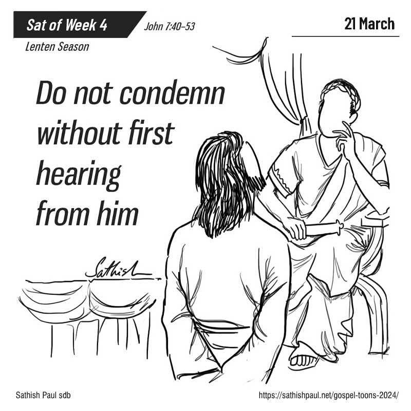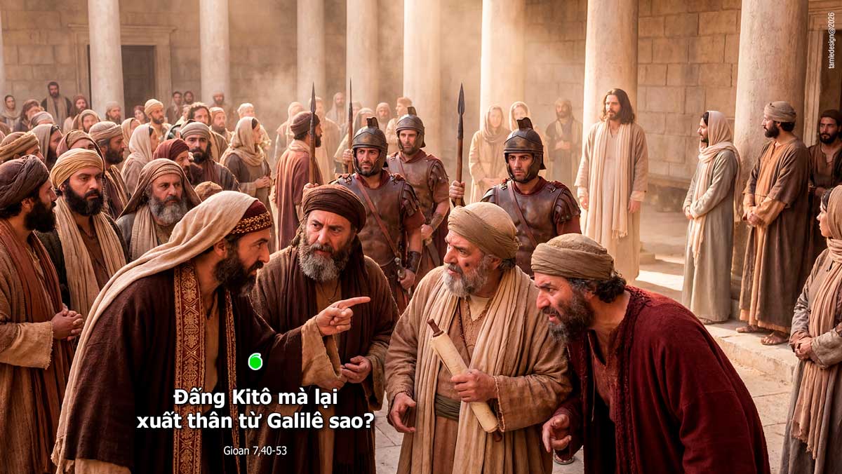 Khi ấy, trong dân chúng, có những người nghe các lời của Đức Giê-su thì nói: “Ông này thật là vị ngôn sứ.” Kẻ khác rằng: “Ông này là Đấng Ki-tô.” Nhưng có kẻ lại nói: “Đấng Ki-tô mà lại xuất thân từ Ga-li-lê sao? Nào Kinh Thánh đã chẳng nói: Đấng Ki-tô xuất thân từ dòng dõi vua Đa-vít và từ Bê-lem, làng của vua Đa-vít sao?” Vậy, vì Người mà dân chúng đâm ra chia rẽ. Một số trong bọn họ muốn bắt Người, nhưng chẳng có ai tra tay bắt. Các vệ binh trở về với các thượng tế và người Pha-ri-sêu. Họ liền hỏi chúng: “Tại sao các anh không điệu ông ấy về đây?” Các vệ binh trả lời: “Xưa nay chưa hề đã có ai nói năng như người ấy!” Người Pha-ri-sêu liền nói với chúng: “Cả các anh nữa, các anh cũng bị mê hoặc rồi sao? Trong hàng thủ lãnh hay trong giới Pha-ri-sêu, đã có một ai tin vào tên ấy đâu? Còn bọn dân đen này, thứ người không biết Lề Luật, đúng là quân bị nguyền rủa!” Trong nhóm Pha-ri-sêu, có một người tên là Ni-cô-đê-mô, trước đây đã đến gặp Đức Giê-su; ông nói với họ: “Lề Luật của chúng ta có cho phép kết án ai, trước khi nghe người ấy và biết người ấy làm gì không?” Họ đáp: “Cả ông nữa, ông cũng là người Ga-li-lê sao? Ông cứ nghiên cứu, rồi sẽ thấy: không một ngôn sứ nào xuất thân từ Ga-li-lê cả.” Sau đó, ai nấy trở về nhà mình. Đó là lời Chúa.