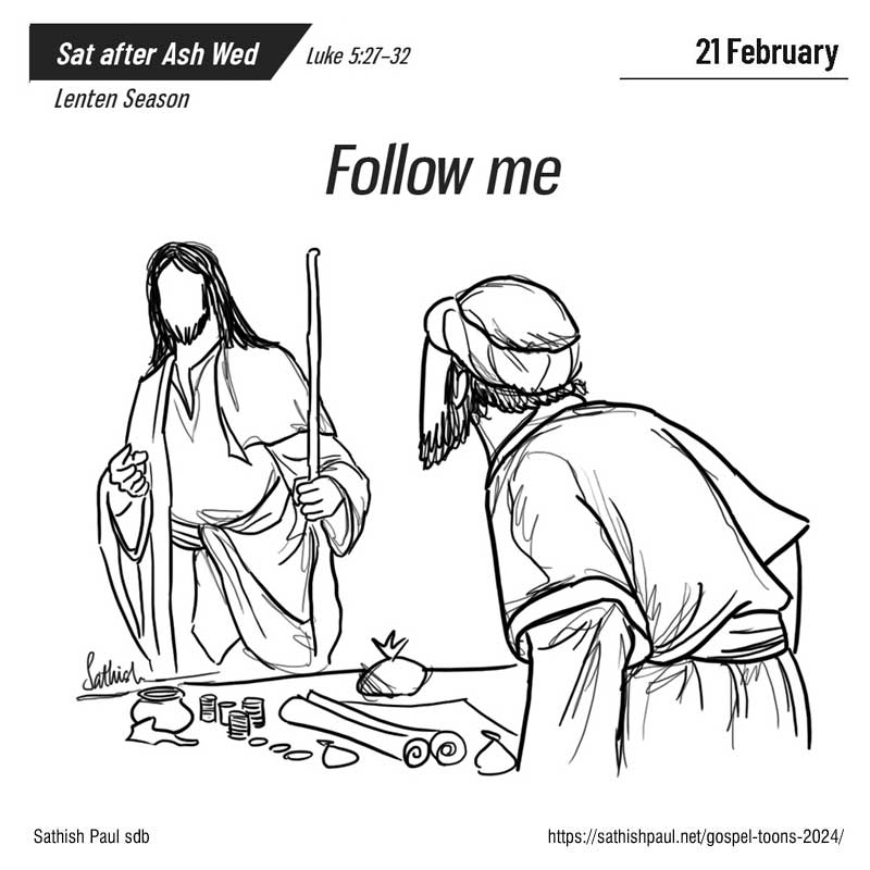 Hôm ấy, Đức Giê-su trông thấy một người thu thuế, tên là Lê-vi, đang ngồi ở trạm thu thuế. Người bảo ông: “Anh hãy theo tôi!” Ông bỏ tất cả, đứng dậy đi theo Người. Ông Lê-vi làm tiệc lớn đãi Người tại nhà ông. Có đông đảo người thu thuế và những người khác cùng ăn với các ngài. Những người Pha-ri-sêu và những kinh sư thuộc nhóm của họ mới lẩm bẩm trách các môn đệ Đức Giê-su rằng: “Sao các ông lại ăn uống với bọn thu thuế và quân tội lỗi?” Đức Giê-su đáp lại họ rằng: “Người khoẻ mạnh không cần thầy thuốc, người đau ốm mới cần. Tôi không đến để kêu gọi người công chính, mà để kêu gọi người tội lỗi sám hối ăn năn.” Đó là lời Chúa.