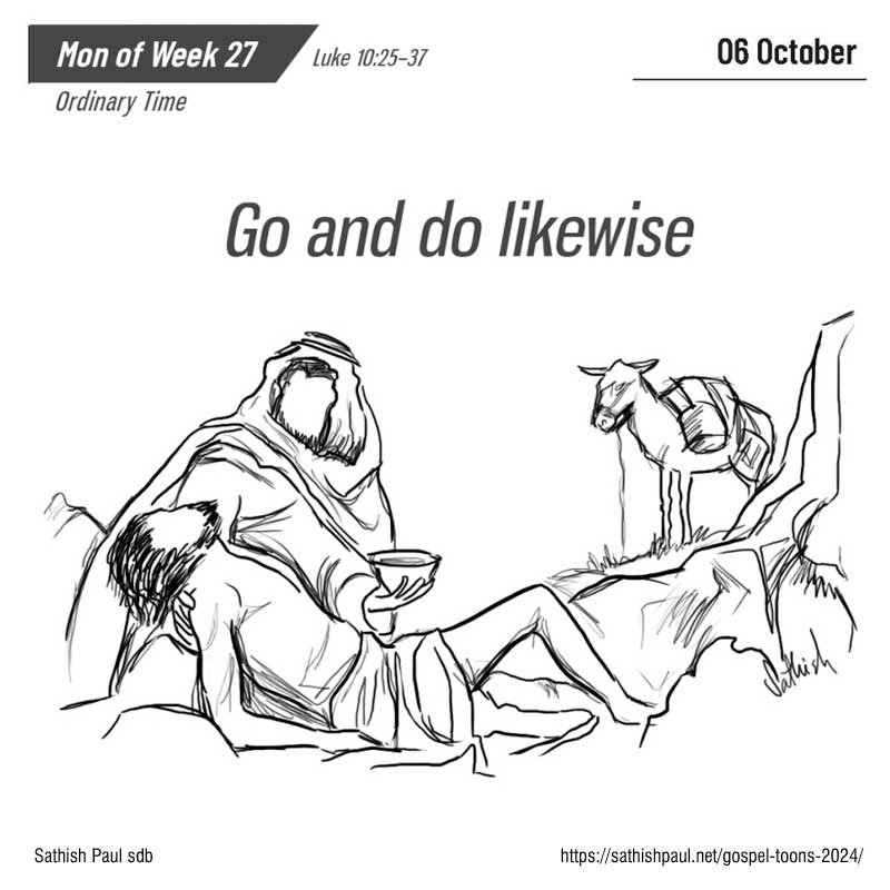 Par hasard, un prêtre descendait par ce chemin ; il le vit et passa de l’autre côté. De même un lévite arriva à cet endroit ; il le vit et passa de l’autre côté. Mais un Samaritain, qui était en route, arriva près de lui ; il le vit et fut saisi de compassion. Il s’approcha, et pansa ses blessures en y versant de l’huile et du vin ; puis il le chargea sur sa propre monture, le conduisit dans une auberge et prit soin de lui. (Lc 10, 25-37)