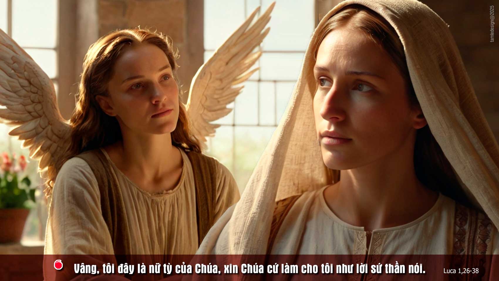 Bà Ê-li-sa-bét có thai được sáu tháng, thì Thiên Chúa sai sứ thần Gáp-ri-en đến một thành miền Ga-li-lê, gọi là Na-da-rét, gặp một trinh nữ đã đính hôn với một người tên là Giu-se, thuộc nhà Đa-vít. Trinh nữ ấy tên là Ma-ri-a. Sứ thần vào nhà trinh nữ và nói: “Mừng vui lên,hỡi Đấng đầy ân sủng, Đức Chúa ở cùng bà”. Nghe lời ấy, bà rất bối rối, và tự hỏi lời chào như vậy có nghĩa gì. Sứ thần liền nói: “Thưa bà Ma-ri-a, xin đừng sợ, vì bà đẹp lòng Thiên Chúa. Và này đây bà sẽ thụ thai, sinh hạ một con trai, và đặt tên là Giê-su. Người sẽ nên cao cả, và sẽ được gọi là Con Đấng Tối Cao. Đức Chúa là Thiên Chúa sẽ ban cho Người ngai vàng vua Đa-vít, tổ tiên Người. Người sẽ trị vì nhà Gia-cóp đến muôn đời,và triều đại của Người sẽ vô cùng vô tận”. Bà Ma-ri-a thưa với sứ thần: “Việc ấy sẽ xảy ra cách nào, vì tôi không biết đến việc vợ chồng!” Sứ thần đáp: “Thánh Thần sẽ ngự xuống trên bà, và quyền năng Đấng Tối Cao sẽ rợp bóng trên bà, vì thế, Đấng Thánh sắp sinh ra sẽ được gọi là Con Thiên Chúa. Kìa bà Ê-li-sa-bét, người họ hàng với bà, tuy già rồi, mà cũng đang cưu mang một người con trai: bà ấy vẫn bị mang tiếng là hiếm hoi, mà nay đã có thai được sáu tháng. Vì đối với Thiên Chúa, không có gì là không thể làm được”. Bấy giờ bà Ma-ri-a nói: “Vâng, tôi đây là nữ tỳ của Chúa, xin Chúa cứ làm cho tôi như lời sứ thần nói”. Rồi sứ thần từ biệt ra đi. Đó là lời Chúa.