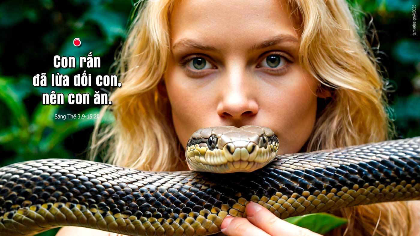 Sau khi A-đam ăn trái cây, Đức Chúa là Thiên Chúa gọi con người và hỏi: “Ngươi ở đâu?” Con người thưa: “Con nghe thấy tiếng Ngài trong vườn, con sợ hãi vì con trần truồng, nên con lẩn trốn.” Đức Chúa là Thiên Chúa hỏi: “Ai đã cho ngươi biết là ngươi trần truồng? Có phải ngươi đã ăn trái cây mà Ta đã cấm ngươi ăn không?” Con người thưa: “Người đàn bà Ngài cho ở với con, đã cho con trái cây ấy, nên con ăn.” Đức Chúa là Thiên Chúa hỏi người đàn bà: “Ngươi đã làm gì thế?” Người đàn bà thưa: “Con rắn đã lừa dối con, nên con ăn.” Đức Chúa là Thiên Chúa phán với con rắn: “Mi đã làm điều đó, nên mi đáng bị nguyền rủa nhất trong mọi loài súc vật và mọi loài dã thú. Mi phải bò bằng bụng, phải ăn bụi đất mọi ngày trong đời mi. Ta sẽ gây mối thù giữa mi và người đàn bà, giữa dòng giống mi và dòng giống người ấy; dòng giống đó sẽ đánh vào đầu mi, và mi sẽ cắn vào gót nó.” … Con người đặt tên cho vợ là E-và, vì bà là mẹ của chúng sinh. Đó là lời Chúa.