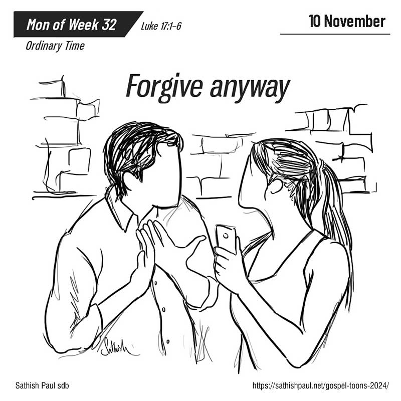 Khi ấy, Đức Giê-su nói với các môn đệ rằng: “Không thể không có những cớ làm cho người ta vấp ngã; nhưng khốn cho kẻ làm cớ cho người ta vấp ngã! Thà buộc cối đá lớn vào cổ nó và xô xuống biển, còn lợi cho nó hơn là để nó làm cớ cho một trong những kẻ bé nhỏ này vấp ngã. Anh em hãy đề phòng! Nếu người anh em của anh xúc phạm đến anh, thì hãy khiển trách nó; nếu nó hối hận , thì hãy tha cho nó. Dù nó xúc phạm đến anh một ngày đến bảy lần, rồi bảy lần trở lại nói với anh: “Tôi hối hận”, thì anh cũng phải tha cho nó.” Các Tông Đồ thưa với Chúa Giê-su rằng: “Thưa Thầy, xin thêm lòng tin cho chúng con.” Chúa đáp: “Nếu anh em có lòng tin lớn bằng hạt cải, thì dù anh em có bảo cây dâu này: “Hãy bật rễ lên, xuống dưới biển kia mà mọc”, nó cũng sẽ vâng lời anh em. Đó là lời Chúa.