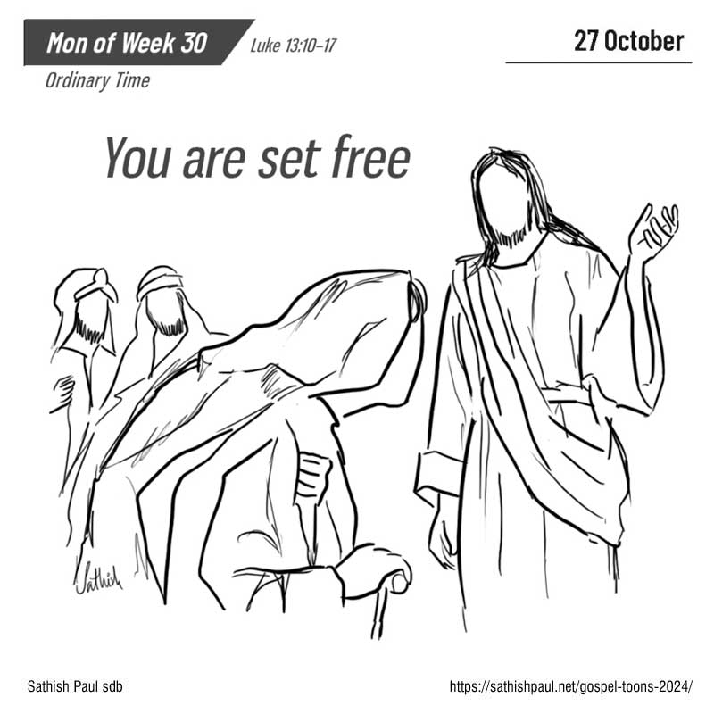 Ngày sa-bát kia, Đức Giê-su giảng dạy trong một hội đường. Ở đó, có một phụ nữ bị quỷ làm cho tàn tật đã mười tám năm. Lưng bà còng hẳn xuống và bà không thể nào đứng thẳng lên được. Trông thấy bà, Đức Giê-su gọi lại và bảo: “Này bà, bà đã được giải thoát khỏi tật nguyền!” Rồi Người đặt tay trên bà, tức khắc bà đứng thẳng lên được và tôn vinh Thiên Chúa. Ông trưởng hội đường tức tối vì Đức Giê-su đã chữa bệnh vào ngày sa-bát. Ông lên tiếng nói với đám đông rằng: “Đã có sáu ngày phải làm việc, thì đến mà xin chữa bệnh những ngày đó, đừng có đến vào ngày sa-bát!” Chúa đáp: “Những kẻ đạo đức giả kia! Thế ngày sa-bát, ai trong các người lại không cởi dây, dắt bò lừa rời máng cỏ đi uống nước? Còn bà này là con cháu ông Áp-ra-ham, bị Xa-tan trói buộc đã mười tám năm nay, thì chẳng lẽ lại không được cởi xiềng xích đó trong ngày sa-bát sao?” Nghe Người nói thế, tất cả những kẻ chống đối Người lấy làm xấu hổ, còn toàn thể đám đông thì vui mừng vì mọi việc hiển hách Người đã thực hiện. Đó là lời Chúa.