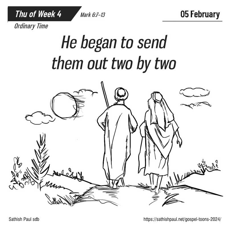 Jésus appela les Douze ; alors il commença à les envoyer en mission deux par deux. Il leur donnait autorité sur les esprits impurs, et il leur prescrivit de ne rien prendre pour la route, mais seulement un bâton ; pas de pain, pas de sac, pas de pièces de monnaie dans leur ceinture. « Mettez des sandales, ne prenez pas de tunique de rechange. » (Mc 6, 7-13)