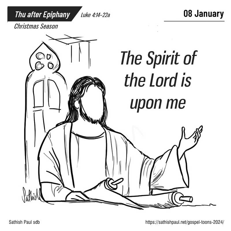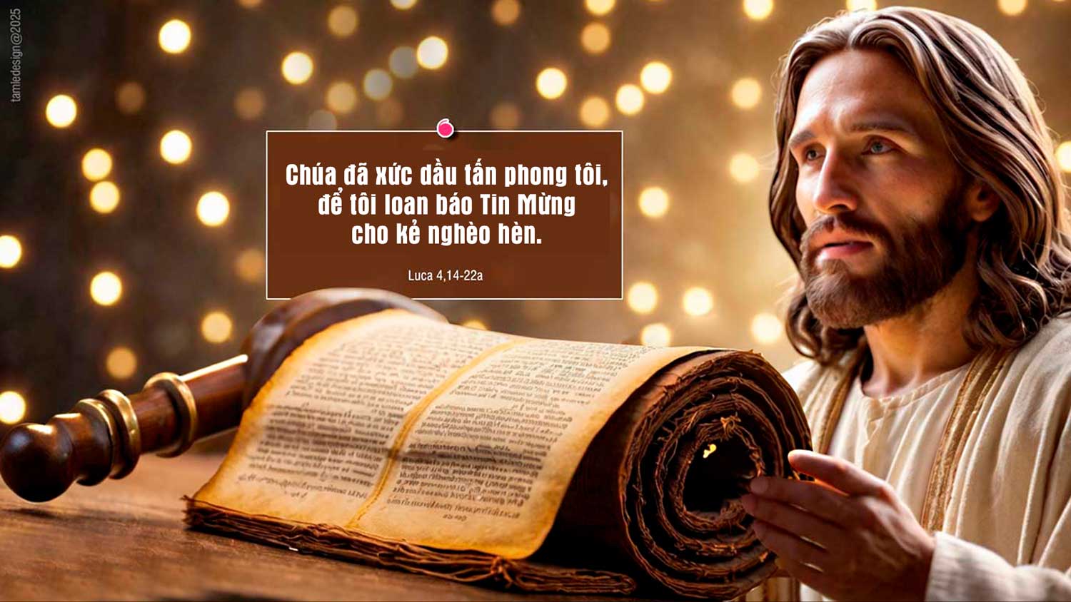 Được đầy quyền năng Thần Khí, Đức Giê-su trở về miền Ga-li-lê, và tiếng tăm Người đồn ra khắp vùng lân cận. Người giảng dạy trong các hội đường của họ, và được mọi người tôn vinh. Rồi Đức Giê-su đến Na-da-rét, là nơi Người sinh trưởng. Người vào hội đường như Người vẫn quen làm trong ngày sa-bát, và đứng lên đọc Sách Thánh. Họ trao cho Người cuốn sách ngôn sứ I-sai-a. Người mở ra, gặp đoạn chép rằng: Thần Khí Chúa ngự trên tôi, vì Chúa đã xức dầu tấn phong tôi, để tôi loan báo Tin Mừng cho kẻ nghèo hèn. Người đã sai tôi đi công bố cho kẻ bị giam cầm biết họ được tha, cho người mù biết họ được sáng mắt, trả lại tự do cho người bị áp bức, công bố một năm hồng ân của Chúa. Đức Giê-su cuộn sách lại, trả cho người giúp việc hội đường, rồi ngồi xuống. Ai nấy trong hội đường đều chăm chú nhìn Người. Người bắt đầu nói với họ: “Hôm nay đã ứng nghiệm lời Kinh Thánh quý vị vừa nghe”. Mọi người đều tán thành và thán phục những lời hay ý đẹp thốt ra từ miệng Người nói ra. Đó là lời Chúa.