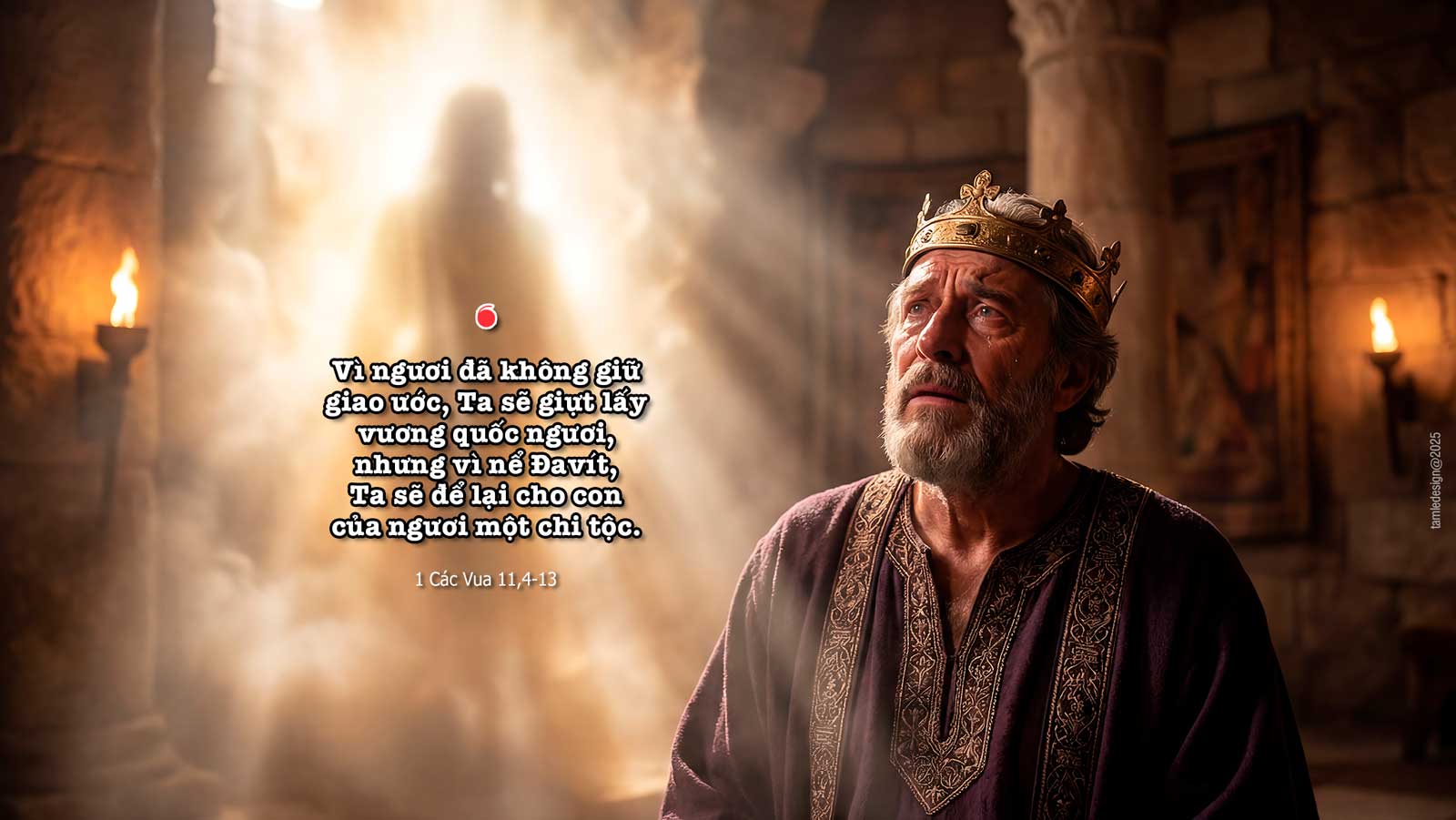 Khi vua Sa-lô-môn về già, các bà vợ của vua đã làm cho lòng vua ngả theo các thần ngoại; lòng vua không còn chung thủy với Đức Chúa Thiên Chúa của vua, như lòng phụ vương Đa-vít nữa. Vua Sa-lô-môn đi theo nữ thần Át-tô-rét của dân Xi-đôn, theo thần Min-côm ghê tởm của dân Am-mon. Như thế, vua Sa-lô-môn làm điều dữ trái mắt Đức Chúa, chứ không theo Đức Chúa trọn vẹn như phụ vương Đa-vít. Bấy giờ vua Sa-lô-môn xây trên núi đối diện với Giê-ru-sa-lem một nơi cao cho thần Cơ-mốt ghê tởm của dân tộc Mô-áp, cho thần Mô-léc ghê tởm của con cái Am-mon. Vua làm như thế với tất cả các bà vợ ngoại đạo của vua; họ đốt hương và sát tế kính các thần của họ. Đức Chúa nổi giận với vua Sa-lô-môn, vì lòng vua rời xa Đức Chúa, Thiên Chúa của Ít-ra-en, Đấng đã hiện ra với vua hai lần và truyền cho vua là đừng đi theo các thần ngoại, nhưng vua không giữ điều Đức Chúa đã truyền. Đức Chúa phán với vua Sa-lô-môn: “Vì ngươi đã như vậy và không giữ giao ước cũng như các giới răn Ta truyền cho ngươi, thì chắc chắn Ta sẽ giựt lấy vương quốc ngươi mà trao cho một thuộc hạ của ngươi. Tuy nhiên, vì thân phụ ngươi, Ta sẽ không làm điều đó trong đời ngươi, nhưng sẽ giựt vương quốc khỏi tay con của ngươi. Hơn nữa, vì nể Đa-vít tôi tớ Ta, và vì Giê-ru-sa-lem, thành đô Ta đã chọn, Ta sẽ không giựt lấy cả vương quốc, nhưng sẽ để lại cho con của ngươi một chi tộc.” Đó là lời Chúa.