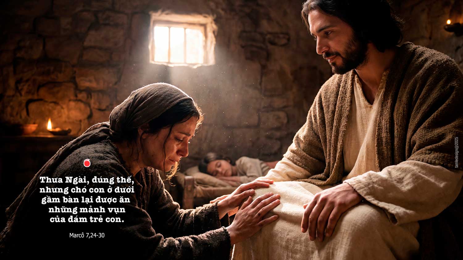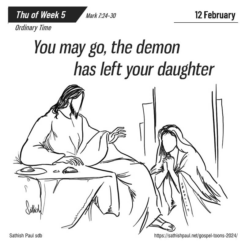 Một hôm, Đức Giê-su đến địa hạt Tia. Người vào một nhà nọ mà không muốn cho ai biết, nhưng không thể giấu được. Thật vậy, một người đàn bà có đứa con gái nhỏ bị quỷ ám, vừa nghe nói đến Người, liền vào sấp mình dưới chân Người. Bà là người Hy-lạp, gốc Phê-ni-xi thuộc xứ Xy-ri-a. Bà xin Người trừ quỷ cho con gái bà. Người nói với bà: “Phải để cho con cái ăn no trước đã, vì không được lấy bánh dành cho con cái mà ném cho chó con.” Bà ấy đáp: “Thưa Ngài, đúng thế, nhưng chó con ở dưới gầm bàn lại được ăn những mảnh vụn của đám trẻ con.” Người nói với bà: “Vì bà nói thế, nên bà cứ về đi, quỷ đã xuất khỏi con gái bà rồi.” Về đến nhà, bà thấy đứa trẻ nằm trên giường và quỷ đã xuất khỏi. Đó là lời Chúa.