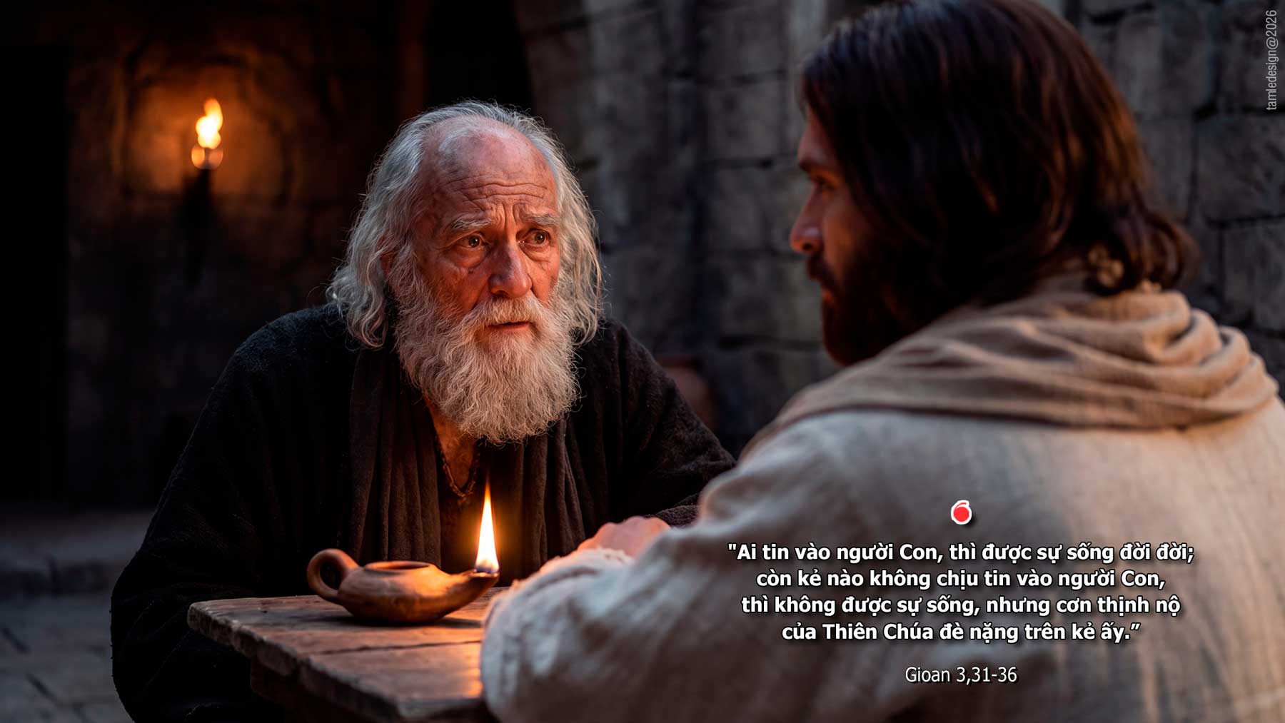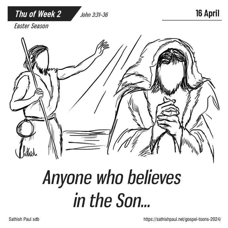 Khi ấy, Đức Giê-su nói với ông Ni-cô-đê-mô rằng: “Đấng từ trên cao mà đến, thì ở trên mọi người; kẻ từ đất mà ra, thì thuộc về đất và nói những chuyện dưới đất. Đấng từ trời mà đến, thì ở trên mọi người; Người làm chứng về những gì Người đã thấy đã nghe, nhưng chẳng ai nhận lời chứng của Người. Ai nhận lời chứng của Người, thì xác nhận Thiên Chúa là Đấng chân thật. Quả vậy, Đấng được Thiên Chúa sai đi, thì nói những lời của Thiên Chúa, vì Thiên Chúa ban Thần Khí cho Người vô ngần vô hạn. Chúa Cha yêu thương người Con và đã giao mọi sự trong tay Người. Ai tin vào người Con, thì được sự sống đời đời; còn kẻ nào không chịu tin vào người Con, thì không được sự sống, nhưng cơn thịnh nộ của Thiên Chúa đè nặng trên kẻ ấy.” Đó là lời Chúa.