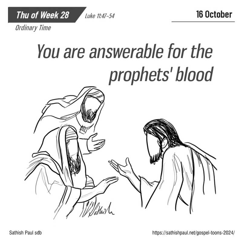 Khi ấy, Chúa Giê-su nói với mấy nhà thông luật rằng: “Khốn cho các người! Các người xây lăng cho các ngôn sứ, nhưng cha ông các người đã giết chết các vị ấy! Như vậy, các người vừa chứng thực vừa tán thành việc làm của cha ông các người, vì họ đã giết các vị ấy, còn các người thì xây lăng. “Vì thế mà Đức Khôn Ngoan của Thiên Chúa đã phán:” Ta sẽ sai Ngôn Sứ và Tông Đồ đến với chúng: chúng sẽ giết người này, lùng bắt người kia. Như vậy, thế hệ này sẽ bị đòi nợ máu tất cả các ngôn sứ đã đổ ra từ tạo thiên lập địa, từ máu ông A-ben đến máu ông Da-ca-ri-a, người đã bị giết giữa bàn thờ và Thánh Điện. Phải, tôi nói cho các người biết: thế hệ này sẽ bị đòi nợ máu. “Khốn cho các người, hỡi những nhà thông luật! Các người đã cất giấu chìa khoá của sự hiểu biết, các người đã không vào, mà những kẻ muốn vào, các người lại ngăn cản”. Khi Đức Giê-su ra khỏi đó, các kinh sư và các người Pha-ri-sêu bắt đầu căm giận Người ra mặt, và vặn hỏi Người về nhiều chuyện, gài bẫy để xem có bắt được Người nói điều gì sai chăng. Đó là lời Chúa.