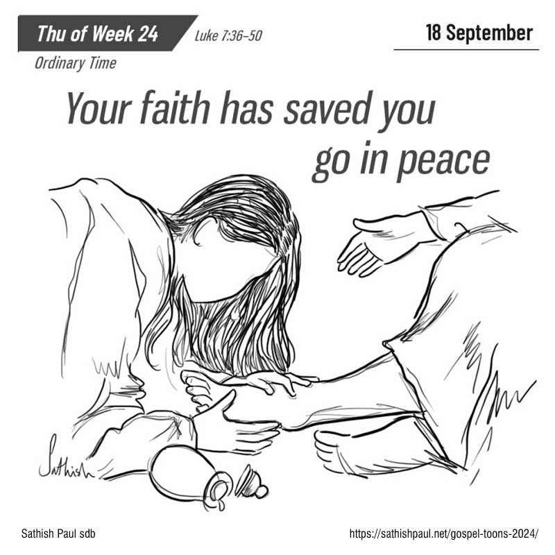 Một hôm, có người thuộc nhóm Pha-ri-sêu mời Đức Giê-su dùng bữa với mình. Đức Giê-su đến nhà người Pha-ri-sêu ấy và vào bàn ăn. Và kìa một phụ nữ vốn là người tội lỗi trong thành, biết được Người đang dùng bữa tại nhà ông Pha-ri-sêu, liền đem theo một bình bạch ngọc đựng dầu thơm. Chị đứng đằng sau, sát chân Người mà khóc, lấy nước mắt mà tưới ướt chân Người. Chị lấy tóc mình mà lau, rồi hôn chân Người và lấy dầu thơm mà đổ lên. Thấy vậy, ông Pha-ri-sêu đã mời Người liền nghĩ bụng rằng: “Nếu quả thật ông này là ngôn sứ, thì hẳn phải biết người đàn bà đang đụng vào mình là ai, là thứ người nào: một người tội lỗi!” Đức Giê-su lên tiếng bảo ông: “Này ông Si-mon, tôi có điều muốn nói với ông!” Ông ấy thưa: “Dạ, xin Thầy cứ nói”. Đức Giê-su nói: “Một chủ nợ kia có hai con nợ: một người nợ năm trăm quan tiền, một người năm chục. Vì họ không có gì để trả, nên chủ nợ đã thương tình tha cho cả hai. Vậy trong hai người đó, ai mến chủ nợ hơn?” Ông Si-mon đáp: “Tôi thiết tưởng là người đã được tha nhiều hơn”. Đức Giê-su bảo: “Ông xét đúng lắm”. Rồi quay lại phía người phụ nữ, Người nói với ông Si-mon: “Ông thấy người phụ nữ này chứ? Tôi vào nhà ông: nước lã, ông cũng không đổ lên chân tôi, còn chị ấy đã lấy nước mắt tưới ướt chân tôi, rồi lấy tóc mình mà lau. Ông đã chẳng hôn tôi một cái, còn chị ấy từ lúc vào đây, đã không ngừng hôn chân tôi. Dầu ô-liu, ông cũng không đổ lên đầu tôi, còn chị ấy thì lấy dầu thơm mà đổ lên chân tôi. Vì thế, tôi nói cho ông hay: tội của chị rất nhiều, nhưng đã được tha, bằng cớ là chị đã yêu mến nhiều. Còn ai được tha ít thì yêu mến ít”. Rồi Đức Giê-su nói với người phụ nữ: “Tội của chị đã được tha rồi”. Bấy giờ những người đồng bàn liền nghĩ bụng: “Ông này là ai mà lại tha được cả tội?” Nhưng Đức Giê-su nói với người phụ nữ: “Lòng tin của chị đã cứu chị. Chị hãy đi bình an”. Đó là lời Chúa.