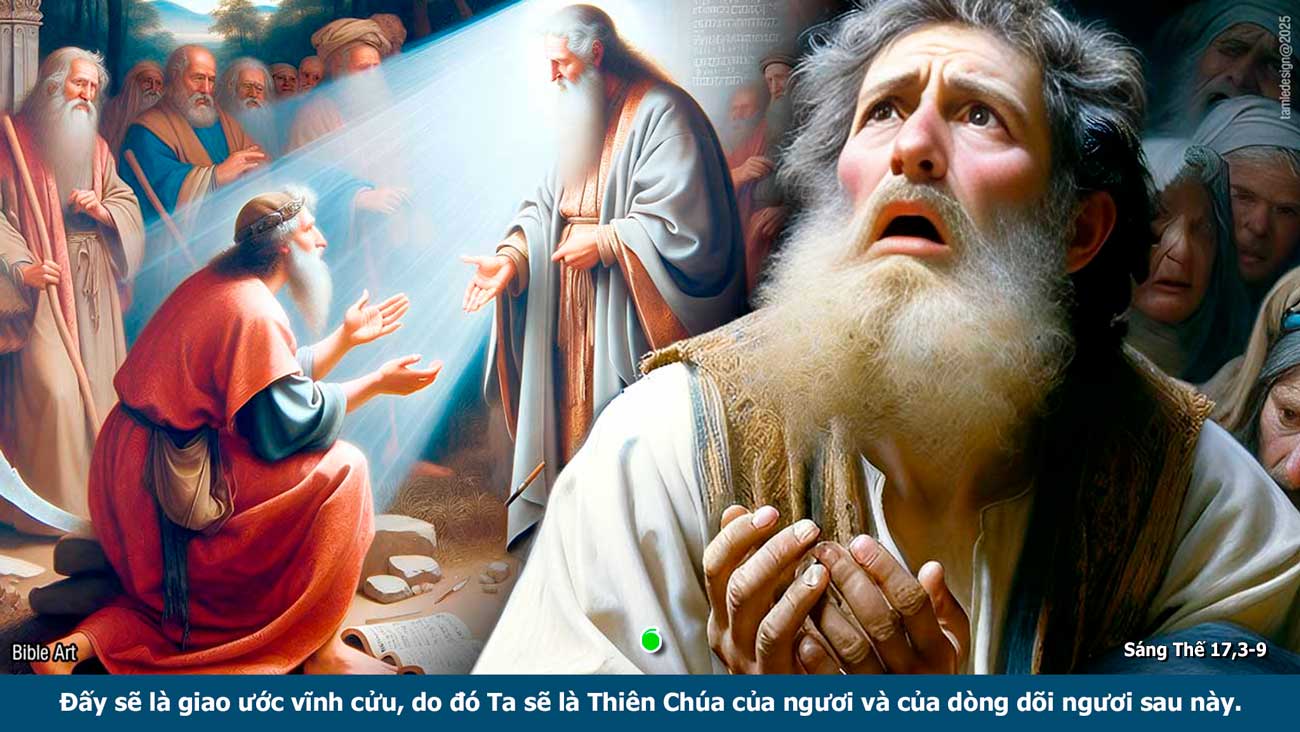 Khi ấy, ông Áp-ram cúi rạp xuống. Thiên Chúa phán với ông rằng: “Phần Ta, đây là giao ước của Ta với ngươi: ngươi sẽ làm cha của vô số dân tộc. Người ta sẽ không còn gọi tên ngươi là Áp-ram nữa, nhưng là Áp-ra-ham, vì Ta đặt ngươi làm cha của vô số dân tộc. Ta sẽ cho ngươi sinh ra nhiều, thật nhiều: Ta sẽ làm cho ngươi thành những dân tộc, và vua chúa sẽ phát xuất từ ngươi. Ta sẽ lập giao ước của Ta giữa Ta với ngươi và với dòng dõi ngươi sau này, từ thế hệ này qua thế hệ khác. Đấy sẽ là giao ước vĩnh cửu, do đó Ta sẽ là Thiên Chúa của ngươi và của dòng dõi ngươi sau này. Ta sẽ ban cho ngươi và dòng dõi ngươi sau này miền đất ngươi đang trú ngụ, tức là tất cả đất Ca-na-an, làm sở hữu vĩnh viễn; và Ta sẽ là Thiên Chúa của chúng.” Thiên Chúa phán với ông Áp-ra-ham: “Phần ngươi, hãy giữ giao ước của Ta, ngươi và dòng dõi ngươi sau này, từ thế hệ này qua thế hệ khác. Đó là lời Chúa.