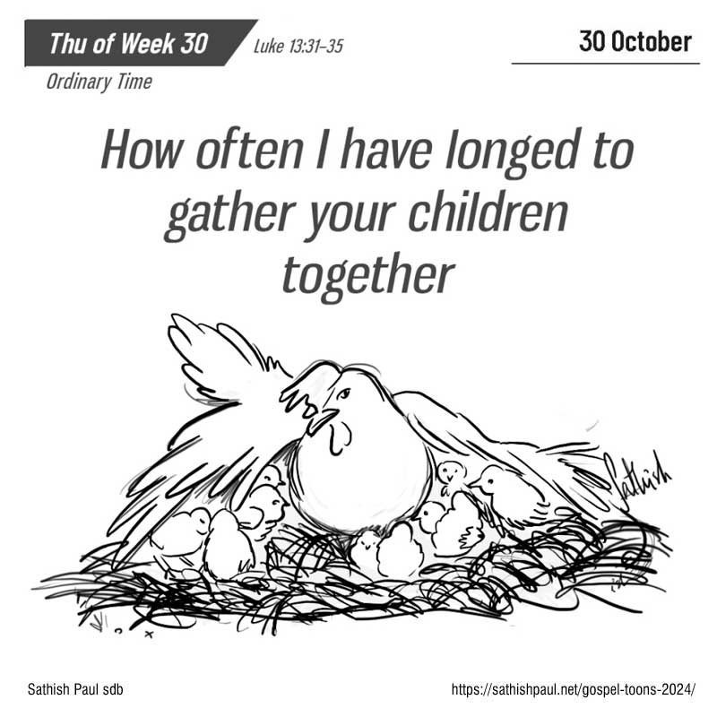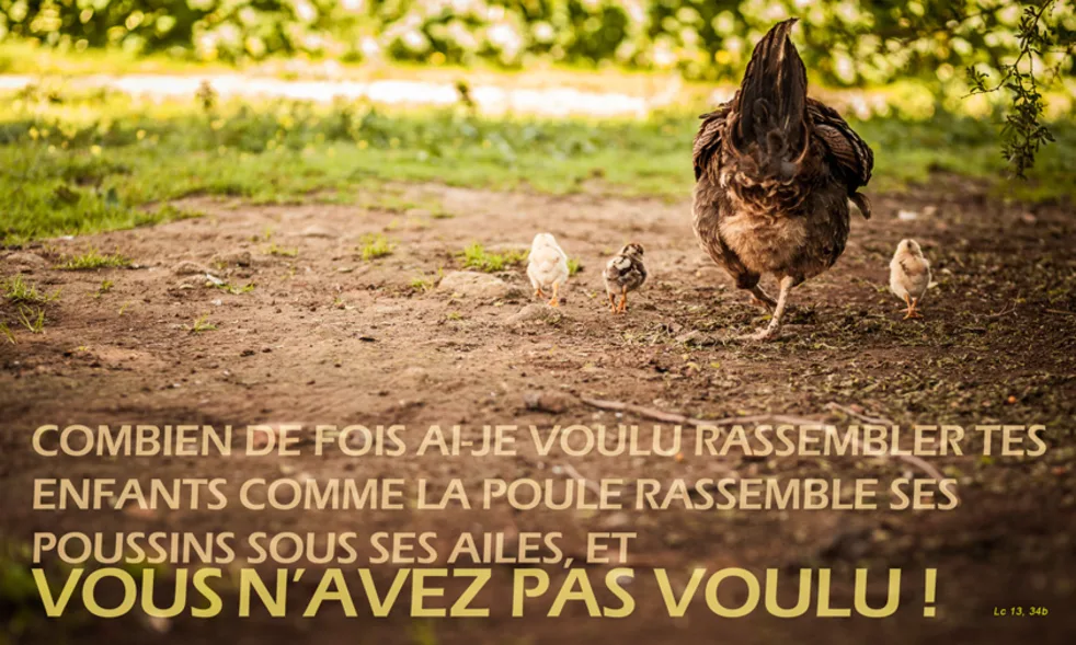 Mais il me faut continuer ma route aujourd’hui, demain et le jour suivant, car il ne convient pas qu’un prophète périsse en dehors de Jérusalem. Jérusalem, Jérusalem, toi qui tues les prophètes et qui lapides ceux qui te sont envoyés, combien de fois ai-je voulu rassembler tes enfants comme la poule rassemble ses poussins sous ses ailes, et vous n’avez pas voulu ! (Lc 13, 31-35)