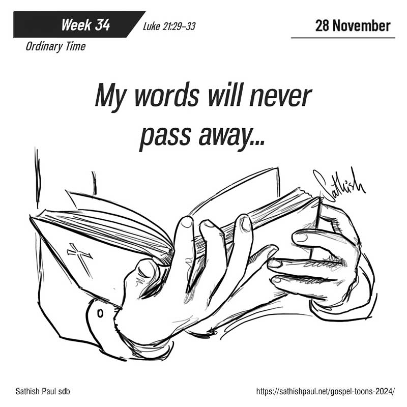 Jésus dit à ses disciples cette parabole : « Voyez le figuier et tous les autres arbres. Regardez-les : dès qu’ils bourgeonnent, vous savez que l’été est tout proche. De même, vous aussi, lorsque vous verrez arriver cela, sachez que le royaume de Dieu est proche. Amen, je vous le dis : cette génération ne passera pas sans que tout cela n’arrive. Le ciel et la terre passeront, mes paroles ne passeront pas. » (Lc 21, 29-33)