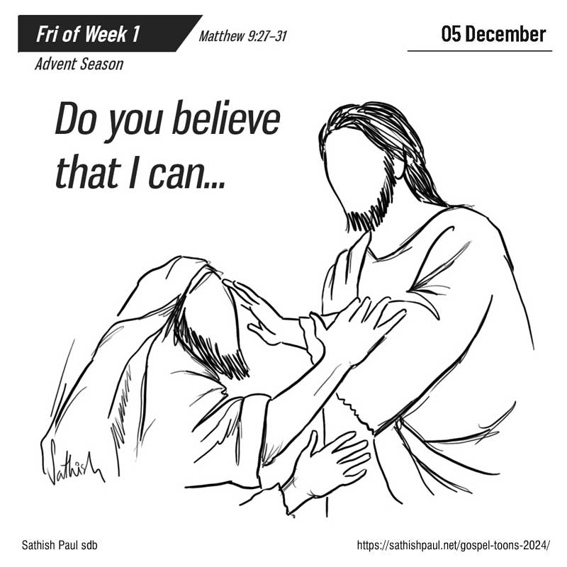 Một hôm, Đức Giê-su đang trên đường đi, thì có hai người mù đi theo kêu lên rằng: “Lạy Con Vua Đa-vít, xin thương xót chúng tôi!” Khi Đức Giê-su về tới nhà, thì hai người mù ấy tiến lại gần. Người nói với họ: “Các anh có tin là tôi làm được điều ấy không?” Họ đáp: “Thưa Ngài, chúng tôi tin.” Bấy giờ Người sờ vào mắt họ và nói: “Các anh tin thế nào thì được như vậy.” Mắt họ liền mở ra. Người nghiêm giọng bảo họ: “Coi chừng, đừng cho ai biết!” Nhưng vừa ra khỏi đó, họ đã nói về Người trong khắp cả vùng. Đó là lời Chúa.
