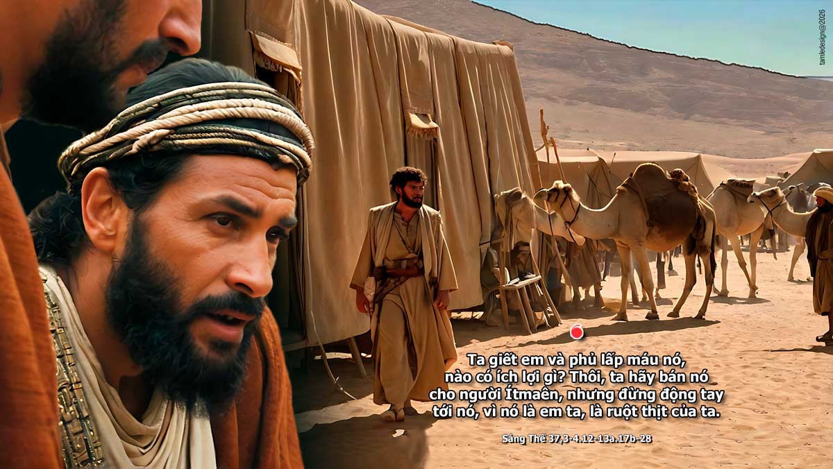 Ông Ít-ra-en yêu Giu-se hơn tất cả các con, vì ông đã già mới sinh được cậu, và ông may cho cậu một áo chùng dài tay. Các anh cậu thấy cha yêu cậu hơn tất cả các anh, thì sinh lòng ghét cậu và không thể nói năng tử tế với cậu… Các anh cậu đã đi chăn chiên dê của cha họ ở Si-khem. Ông Ít-ra-en bảo Giu-se: “Các anh con đang chăn chiên dê ở Si-khem phải không? Lại đây, cha sai con đến với các anh.”… Giu-se theo các anh và tìm thấy họ ở Đô-than. Họ thấy cậu từ xa, và trước khi cậu tới gần họ thì họ lập mưu giết chết cậu. Họ bảo nhau: “Thằng tướng chiêm bao đang đến kia! Bây giờ, nào ta giết và ném nó xuống một cái giếng. Ta sẽ nói là một thú dữ đã ăn thịt nó. Rồi ta sẽ thấy các chiêm bao của nó đi tới đâu!” Nghe thấy thế, Rưu-vên tìm cách cứu em khỏi tay họ; cậu nói: “Ta đừng đụng tới mạng sống nó.” Rưu-vên bảo họ: “Đừng đổ máu! Cứ ném nó xuống cái giếng kia trong sa mạc, nhưng đừng giơ tay hại nó.” Cậu có ý cứu em khỏi tay họ và đưa về cho cha. Vậy khi Giu-se đến chỗ các anh, thì họ lột áo chùng của cậu, chiếc áo chùng dài tay cậu đang mặc. Họ túm lấy cậu và ném xuống cái giếng; giếng đó cạn, không có nước. Rồi họ ngồi xuống dùng bữa. Ngước mắt lên, họ thấy một đoàn người Ít-ma-en đang từ Ga-la-át tới. Lạc đà của những người này chở nhựa thơm, nhũ hương và mộc dược để đưa xuống Ai-cập. Giu-đa nói với các anh em: “Ta giết em và phủ lấp máu nó, nào có ích lợi gì? Thôi, ta hãy bán nó cho người Ít-ma-ên, nhưng đừng động tay tới nó, vì nó là em ta, là ruột thịt của ta.” Các anh em nghe cậu. Những lái buôn người Ma-đi-an đi qua đó kéo Giu-se lên khỏi giếng, rồi bán cậu cho người Ít-ma-ên hai mươi đồng bạc. Những người này đưa Giu-se sang Ai-cập. Đó là lời Chúa.