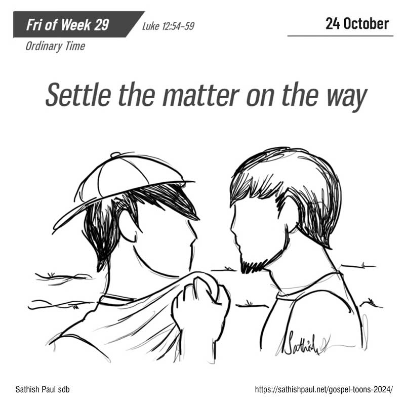 Khi ấy, Đức Giê-su cũng nói với đám đông rằng: “Khi các người thấy mây kéo lên ở phía tây, các người nói ngay: “Mưa đến nơi rồi”, và xảy ra đúng như vậy. Khi thấy gió nồm thổi, các người nói: “Trời sẽ oi bức”, và xảy ra đúng như vậy. Những kẻ đạo đức giả kia, cảnh sắc đất trời, thì các người biết nhận xét, còn thời đại này, sao các người lại không biết nhận xét? “Sao các người không tự mình xét xem cái gì là phải? Thật vậy, khi anh đi cùng đối phương ra toà, thì dọc đường hãy cố gắng giải quyết với người ấy cho xong, kẻo người ấy lôi anh đến quan toà, quan toà lại nộp anh cho thừa phát lại, và thừa phát lại tống anh vào ngục. Tôi bảo cho anh biết: anh sẽ không ra khỏi đó trước khi trả hết đồng kẽm cuối cùng.” Đó là lời Chúa.