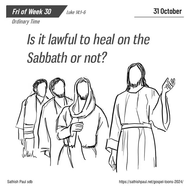 Prenant la parole, Jésus s’adressa aux docteurs de la Loi et aux pharisiens pour leur demander : « Est-il permis, oui ou non, de faire une guérison le jour du sabbat ? » Ils gardèrent le silence. Tenant alors le malade, Jésus le guérit et le laissa aller. Puis il leur dit : « Si l’un de vous a un fils ou un bœuf qui tombe dans un puits, ne va-t-il pas aussitôt l’en retirer, même le jour du sabbat ? » Et ils furent incapables de trouver une réponse. (Lc 14, 1-6)