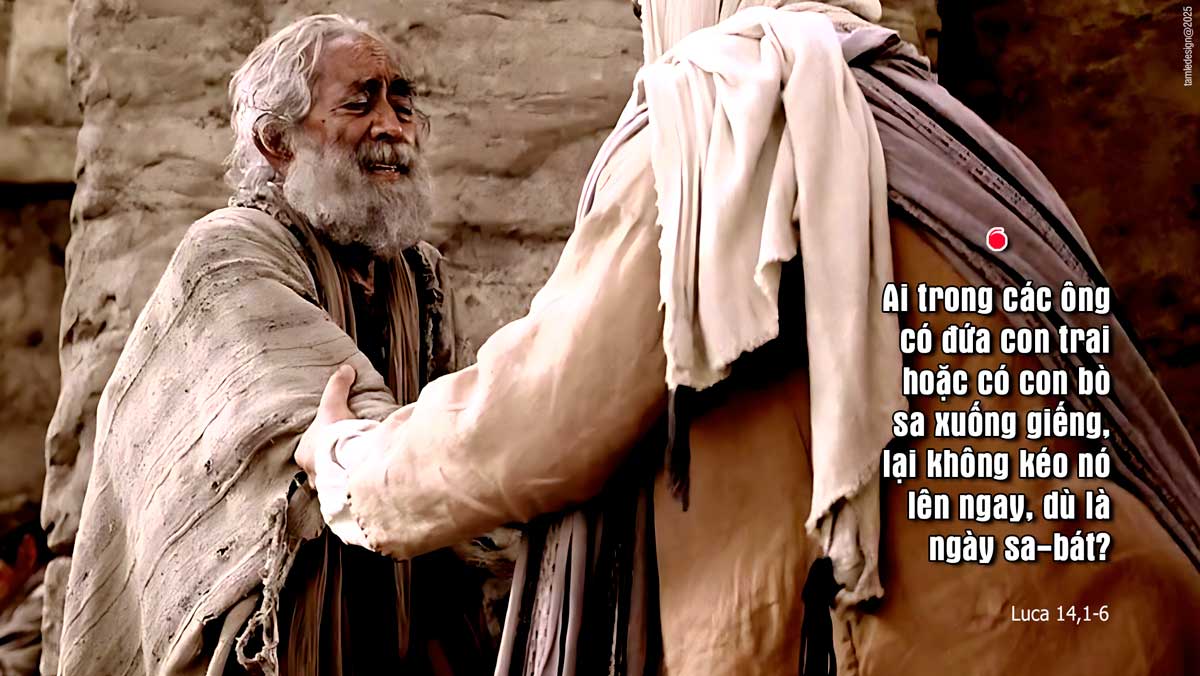 Một ngày sa-bát kia, Đức Giê-su đến nhà một ông thủ lãnh nhóm Pha-ri-sêu để dùng bữa: họ cố dò xét Người. Và kìa trước mặt Đức Giê-su, có một người mắc bệnh phù thũng. Người lên tiếng nói với các nhà thông luật và những người Pha-ri-sêu: “Có được phép chữa bệnh ngày sa-bát hay không?” Nhưng họ làm thinh. Người đỡ lấy bệnh nhân, chữa khỏi và cho về. Rồi Người nói với họ: “Ai trong các ông có đứa con trai hoặc có con bò sa xuống giếng, lại không kéo nó lên ngay, dù là ngày sa-bát?” Và họ không thể đáp lại những lời đó. Đó là lời Chúa.