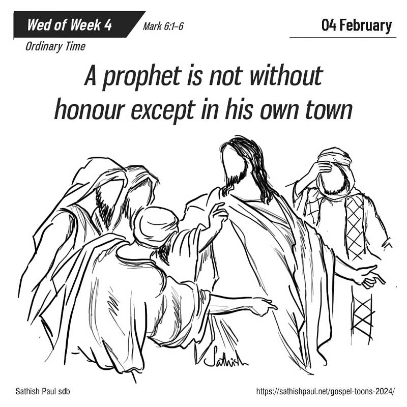 Et ils étaient profondément choqués à son sujet. Jésus leur disait : « Un prophète n’est méprisé que dans son pays, sa parenté et sa maison. » Et là il ne pouvait accomplir aucun miracle ; il guérit seulement quelques malades en leur imposant les mains. Et il s’étonna de leur manque de foi. Alors Jésus parcourait les villages d’alentour en enseignant. (Mc 6, 1-6)